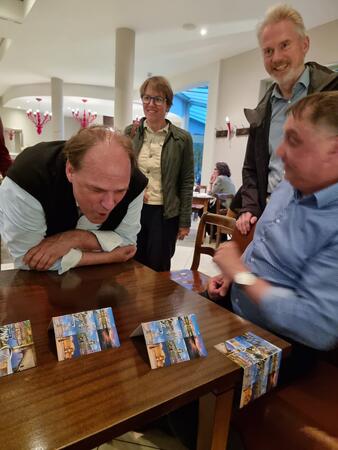 Schon am Abend startete unsere eigentliche Veranstaltung – denn es handelte sich bei unserer Ausfahrt um eine Rallye – mit der ersten Wertungsprüfung, der Ermittlung der Startnummern: 5 in der Mitte geknickte Postkarten sollten so sanft in Richtung Tischkante gepustet werden, dass sie genau auf der Tischkante zum Liegen kamen. Nicht einfach, wenn die Tischkante abgerundet ist. Jeannine war daher ständig halb unter dem Tisch, um die heruntergefallenen Karten aufzuheben!