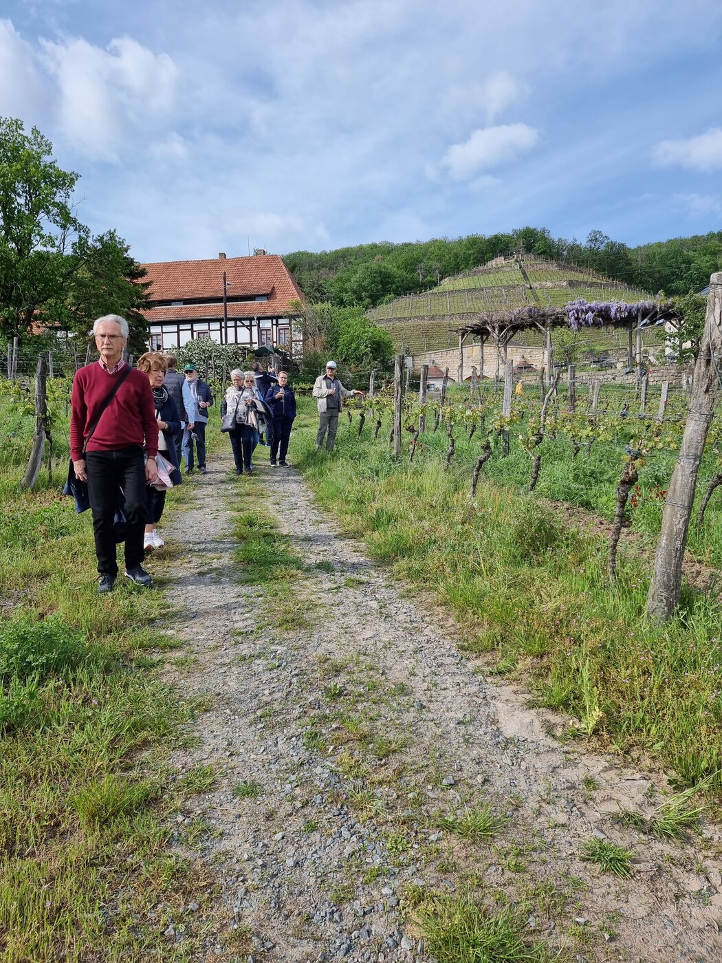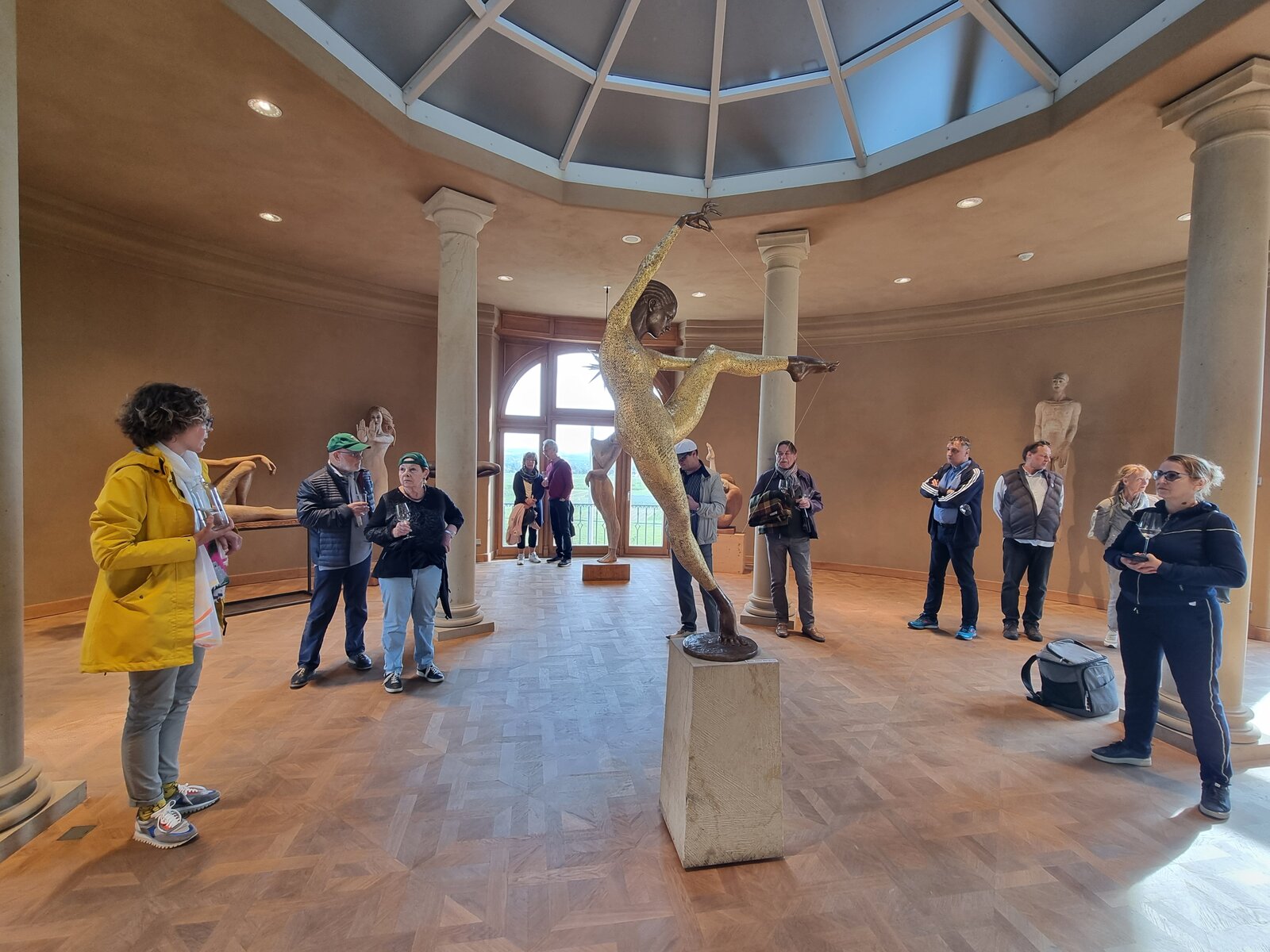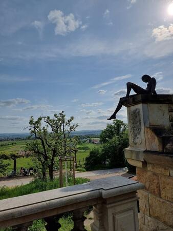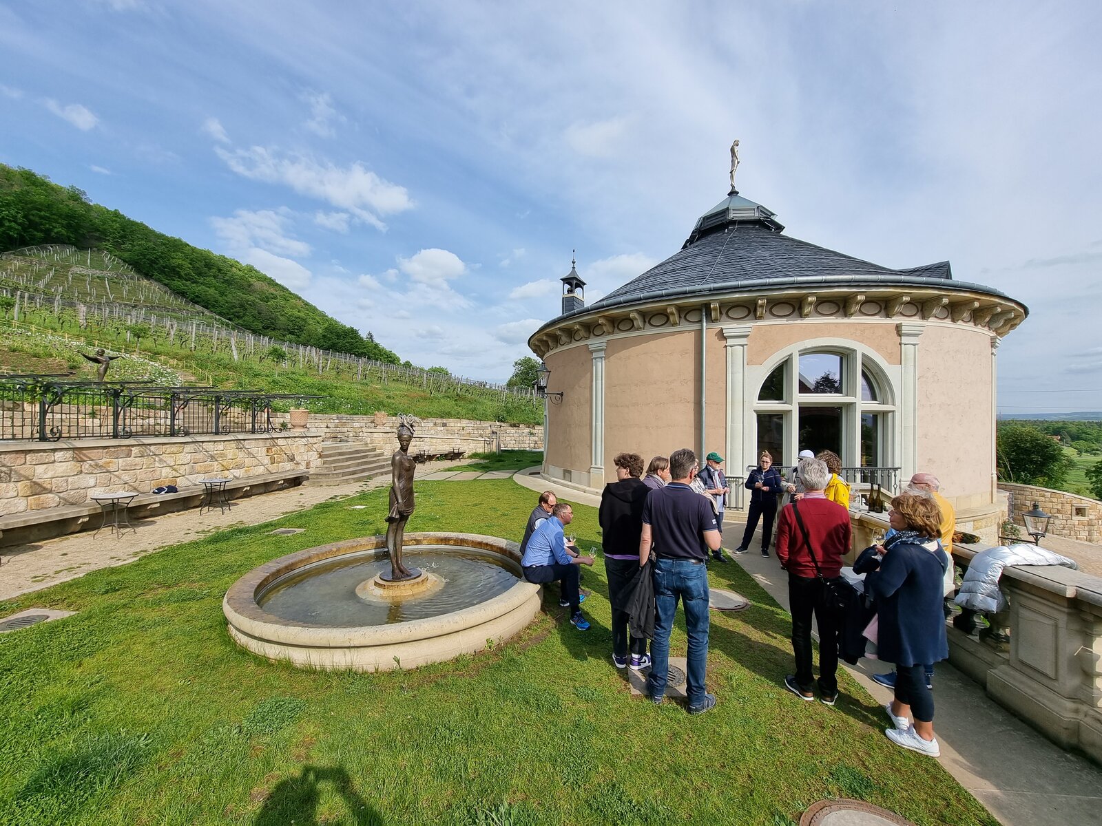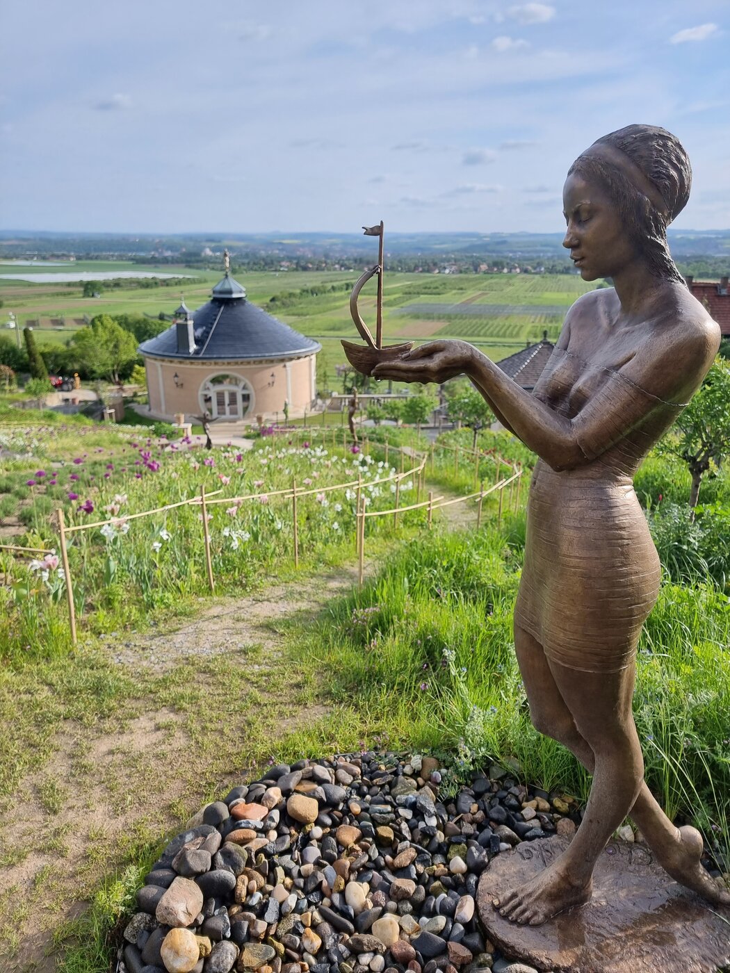 Das Programm startete am Anreisetag, dem 17. Mai 2023 unter dem Motto „Vinum lac senum“ – Der Wein ist die Milch des Alters – im Weingut Zimmerling, einen kleinen Fußmarsch oberhalb des Schlosshotels Pillnitz gelegen. Alleine die malerische Aussicht über die Elbe ist spektakulär, wie der Kunstgarten des Weingutes (https://www.weingut-zimmerling.de), der geprägt ist durch die Skulpturen von Malgorzata Chodakowska, der Frau des Gutsinhabers. Ein kleines, aber feines Weingut mit hervorragenden Produkten, die uns während einer schönen und entspannten Führung nahe gebracht wurden.