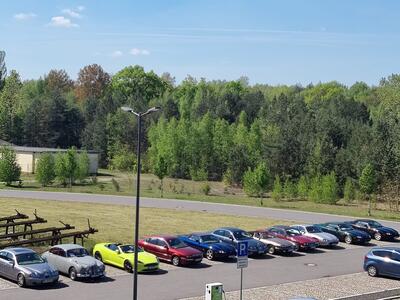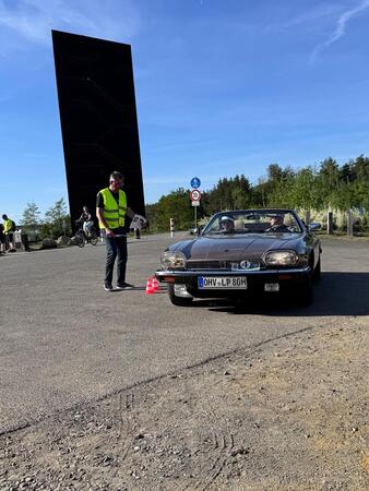 Freitag, 2.5.25. Ab 9.30 Uhr die Ausgabe der Roadbooks und geplante 110 Straßenkilometer. Es ist Freitag, der Tag, an dem die Parkplätze der städtischen Einkaufszentren immer gut gefüllt sind. Dennoch halten wir unser Wettbewerbsspiel dort ab. Wo ist bei Deinem Fahrzeug die Rückfahrleuchte eingebaut? Ha, das weiß nicht jeder!