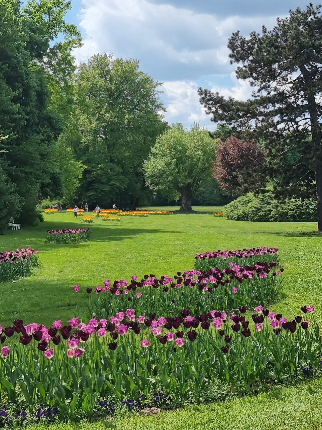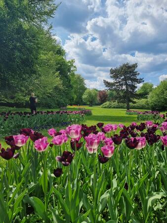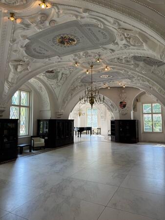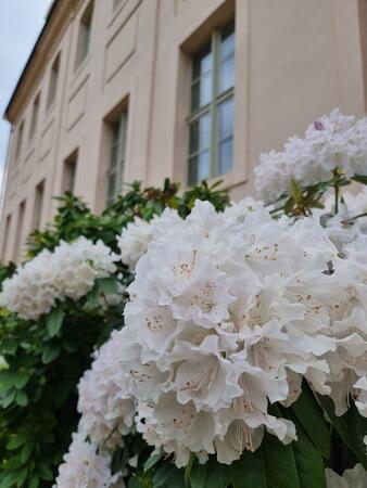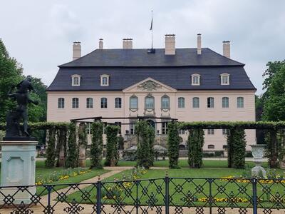 Im Neuen Schloss stehen auf der Terrasse Tische für einen Imbiss bereit. Der Blick auf den Park bei angenehmer Wärme des Frühsommers. Selbstverständlich wird hier auch Fürst-Pückler-Eis serviert!
