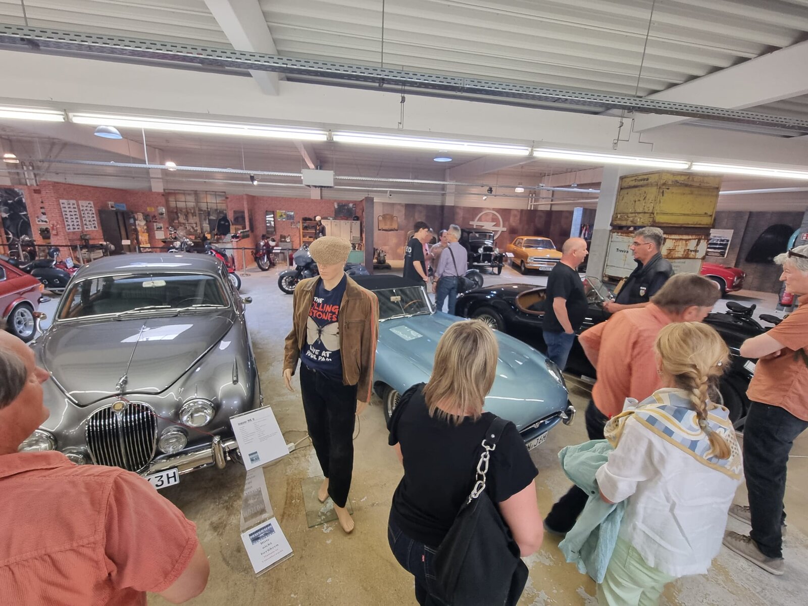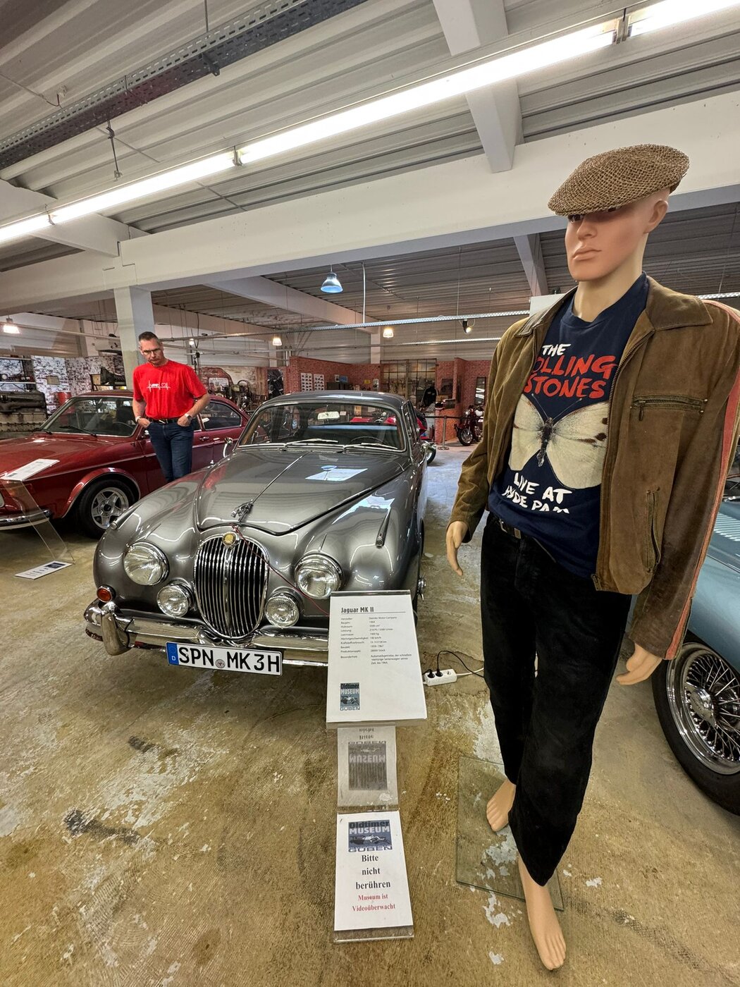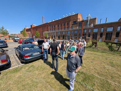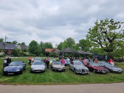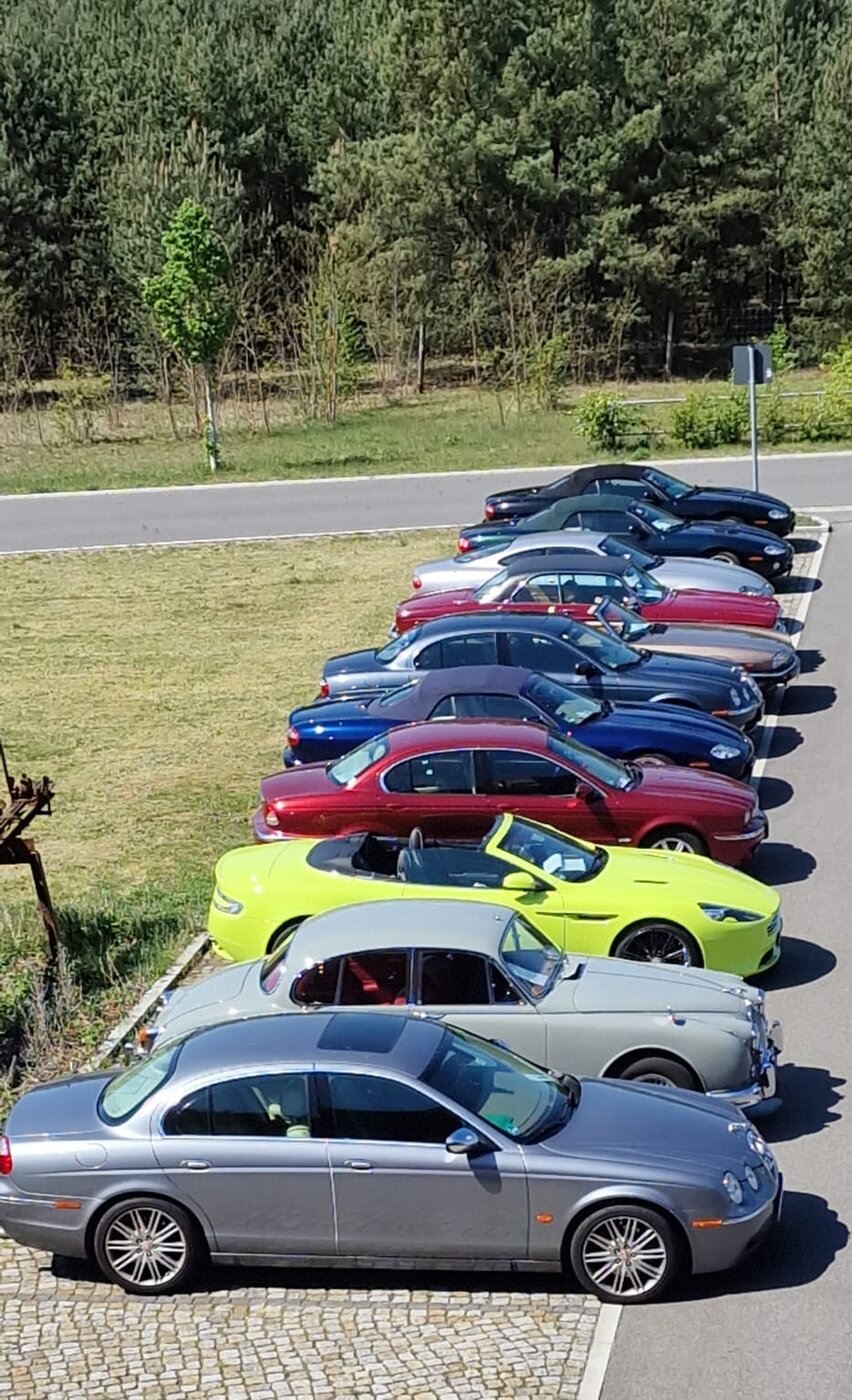 Samstag, 3.5.25. Ab 9 Uhr Ausgabe der Roadbooks und geplante 195 Straßenkilometer. Das erste Ziel des Tages ist die Stadt Guben, nordöstlich von Cottbus an der Neiße gelegen. Wir stellen die Katzen auf dem Parkplatz eines Möbelhauses ab. Im nicht mehr benötigten 2. Stock des Hauses hat sich der örtliche Oldtimer-Verein ein eigenes Reich für seine umfangreiche Fahrzeugausstellung geschaffen. Der Lastenfahrstuhl macht es möglich, auch Schwergewichte wie das Prachtstück eines 20er Jahre Bentley hinauf zuschaffen. Jaguare sind mit einem XK 120 OTS, einem MK 2 3,4l und einem E-Type Serie 1 hier sehr gut vertreten! Feine Vertreter aus ost- und westdeutscher Fahrzeugproduktion, u.a. P70 und Opel Kadett, einige Vorkriegsseltenheiten von BMW und Mercedes werden uns fachkundig erklärt. Auch die Sammlung von Mopeds und Motorrädern, Vor- und Nachkrieg, unzählige fahrzeugbezogene Werbung, Werkzeuge und Zubehöre sind hier sehenswert und thematisch geordnet. In diesem Männerparadies darf natürlich eine Bar und urige Sitzgelegenheiten nicht fehlen! Die 60er-Jahre-Jukebox spielt uns Passendes von Vorgestern und am Bartresen sitzt man bequem auf den Sitzbänken abgeflexter hinterer Vespa-Hälften. Kuchen, Kaffee und andere Getränke, Bockwurst mit Schrippe werden gereicht. Alles prima, hier lässt es sich gut verweilen.