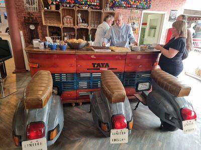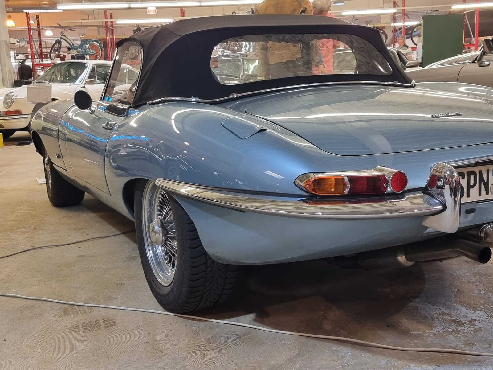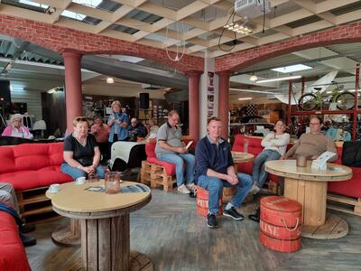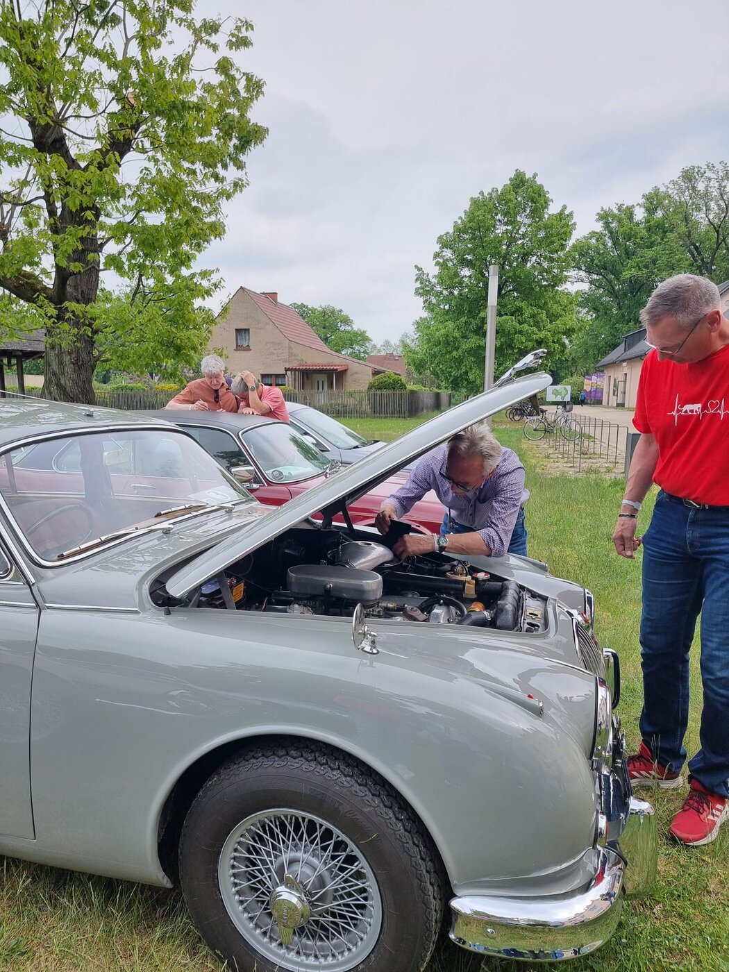 Samstag, 3.5.25. Ab 9 Uhr Ausgabe der Roadbooks und geplante 195 Straßenkilometer. Das erste Ziel des Tages ist die Stadt Guben, nordöstlich von Cottbus an der Neiße gelegen. Wir stellen die Katzen auf dem Parkplatz eines Möbelhauses ab. Im nicht mehr benötigten 2. Stock des Hauses hat sich der örtliche Oldtimer-Verein ein eigenes Reich für seine umfangreiche Fahrzeugausstellung geschaffen. Der Lastenfahrstuhl macht es möglich, auch Schwergewichte wie das Prachtstück eines 20er Jahre Bentley hinauf zuschaffen. Jaguare sind mit einem XK 120 OTS, einem MK 2 3,4l und einem E-Type Serie 1 hier sehr gut vertreten! Feine Vertreter aus ost- und westdeutscher Fahrzeugproduktion, u.a. P70 und Opel Kadett, einige Vorkriegsseltenheiten von BMW und Mercedes werden uns fachkundig erklärt. Auch die Sammlung von Mopeds und Motorrädern, Vor- und Nachkrieg, unzählige fahrzeugbezogene Werbung, Werkzeuge und Zubehöre sind hier sehenswert und thematisch geordnet. In diesem Männerparadies darf natürlich eine Bar und urige Sitzgelegenheiten nicht fehlen! Die 60er-Jahre-Jukebox spielt uns Passendes von Vorgestern und am Bartresen sitzt man bequem auf den Sitzbänken abgeflexter hinterer Vespa-Hälften. Kuchen, Kaffee und andere Getränke, Bockwurst mit Schrippe werden gereicht. Alles prima, hier lässt es sich gut verweilen.