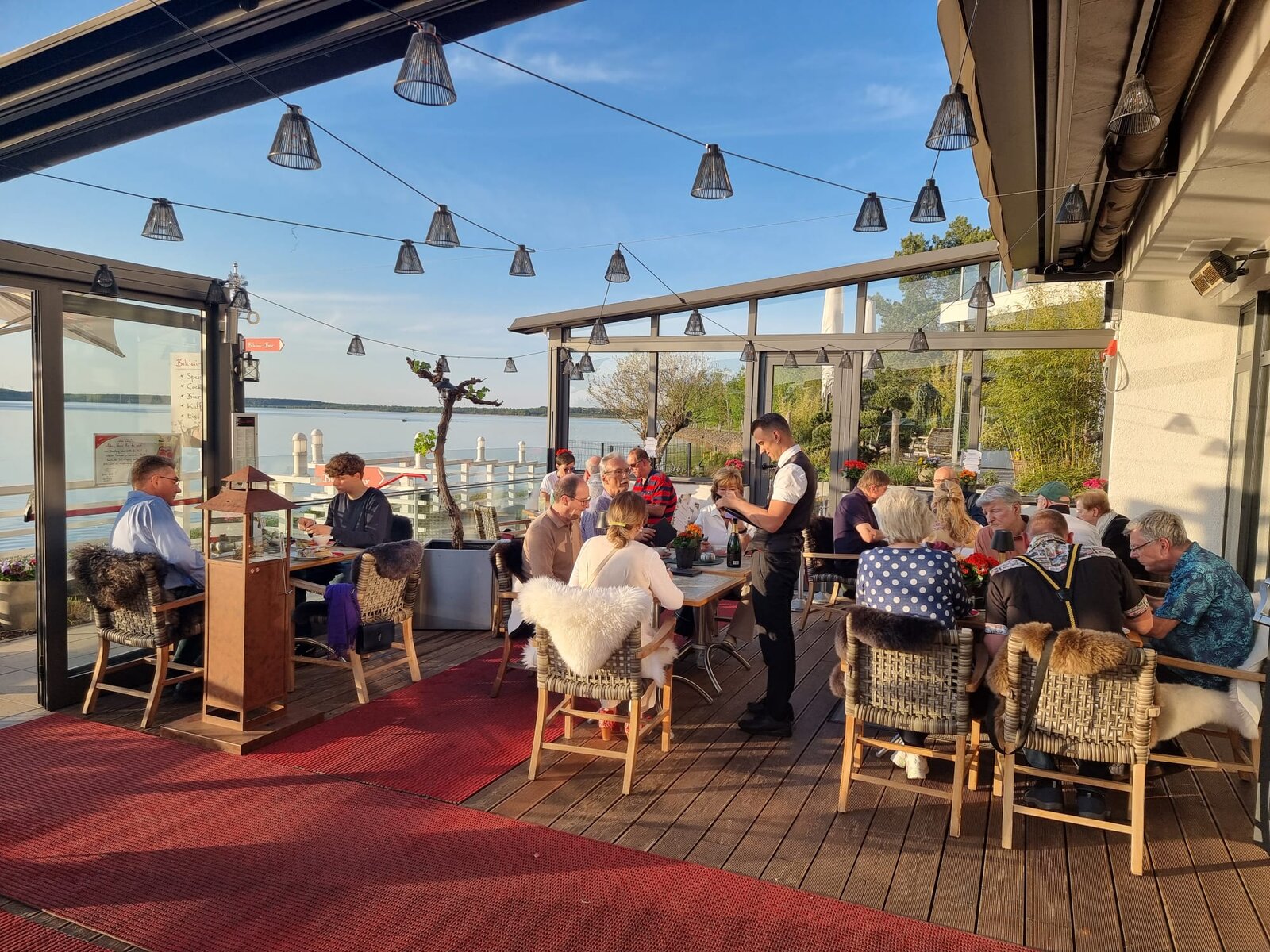 Zurück im Hotel, ist gegen 18 Uhr ein Grillbuffet im Bootshaus vorgesehen. Der angesagte Dresscode nennt sich wieder „Casual chic“. Anregende Gespräche an den runden Tischen und die Erwartung auf Morgen. Wieder entsteht ein Sonnenuntergang über dem See, wie bei Capri besungen.