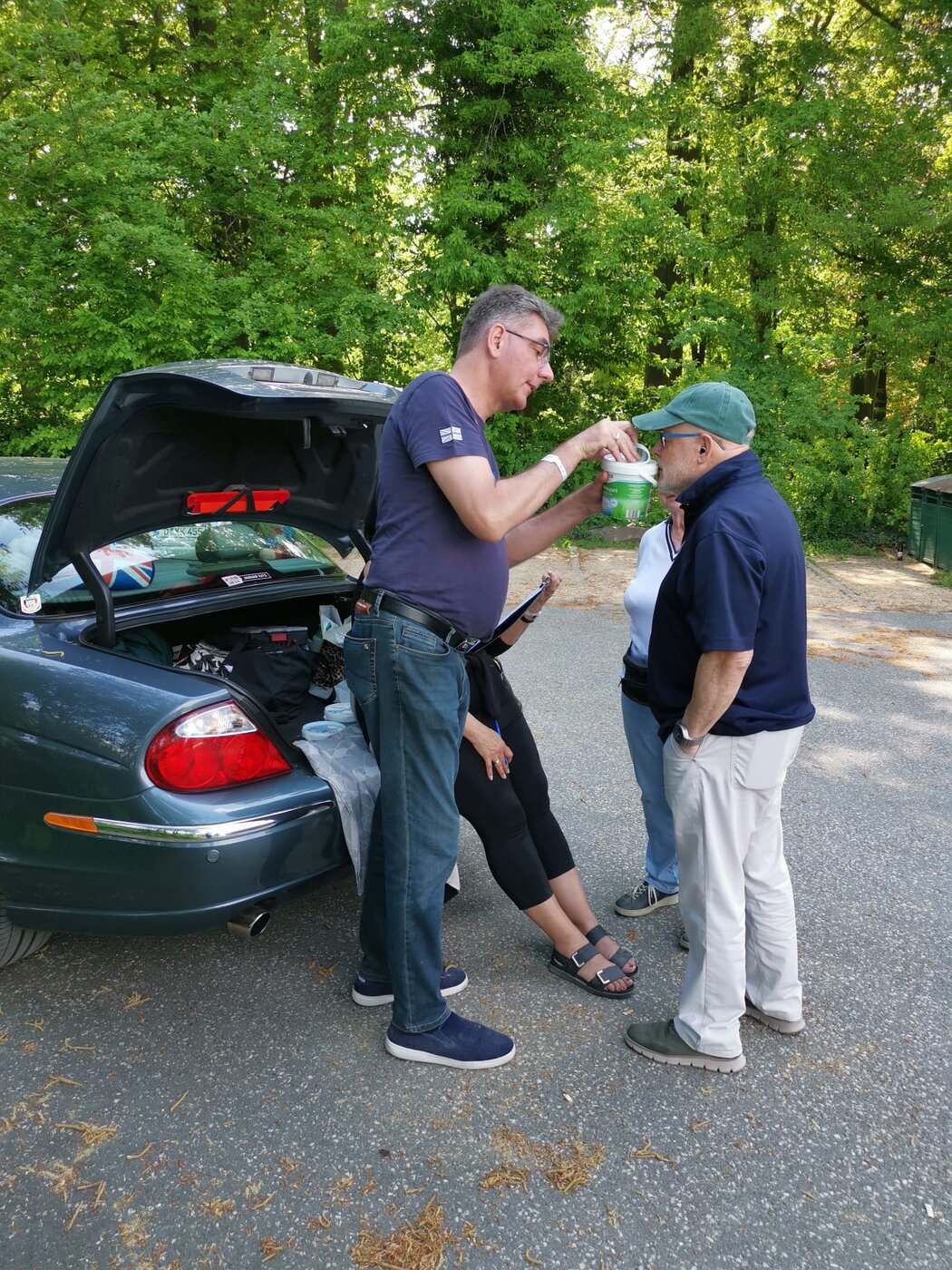 Auf dem Parkplatz findet anschließend ein nächstes Wettbewerbsspiel statt. Erschnüffeln und Benennen von Flüssigkeiten, die zum Betrieb von Kraftfahrzeugen gehören könnten. Sehr schwer, wenn man nur die bekannten Gerüche von Altöl, Benzin und Diesel erwartet! Diese Gerüche erinnern aber mehr an Lebensmittel-Aromen, als an Kfz-Betriebsmittel. Wir tun uns alle schwer mit den richtigen Antworten.
