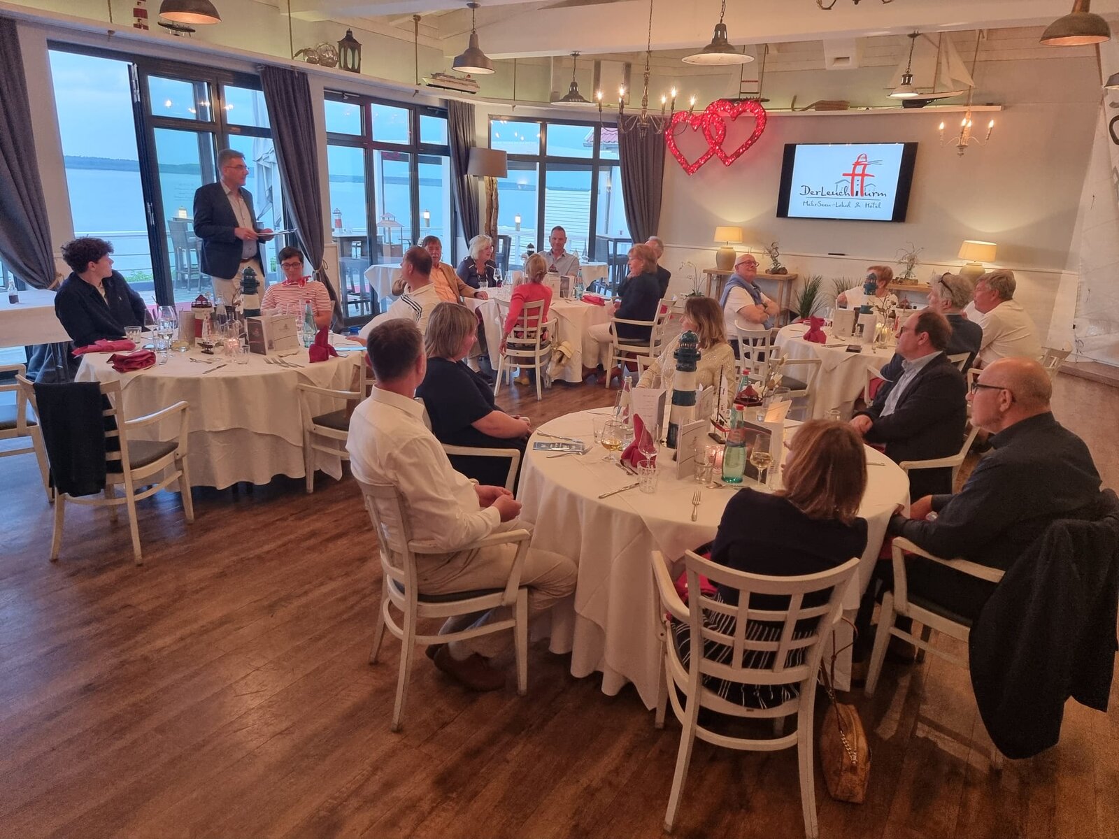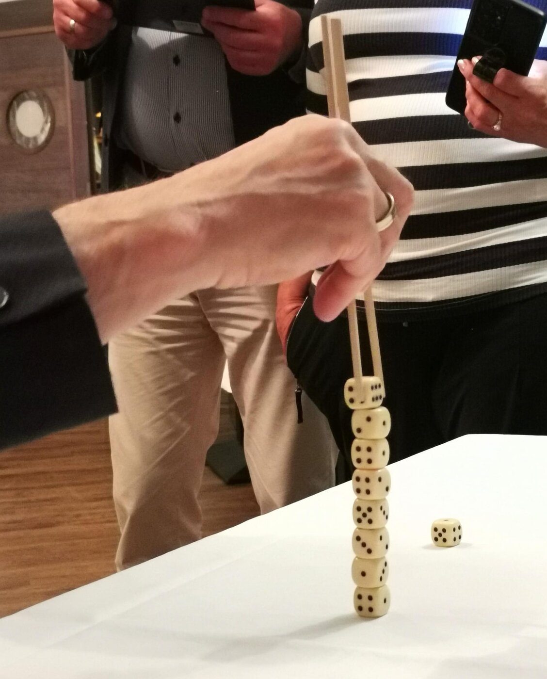 Sodann erfolgt die direkte Fahrt zurück zum Leuchtturm Hotel. Dresscode ist heute Abend „Maritim elegant“. Das wird erwartet zum Vier-Gänge-Menu ab 18 Uhr. Dieser Code kann mit der Kleidung der Caprifischer oder auch der von Karibikpiraten erfüllt werden, vermute ich. Ein weiteres Wettbewerbspiel läßt uns Würfel mit Hilfe von Ess-Stäbchen auftürmen. Konzentrationsübung bei ruhiger Hand, nicht einfach zu erfüllen. Es ist es ein geselliger Abend in gut gelaunter Runde.