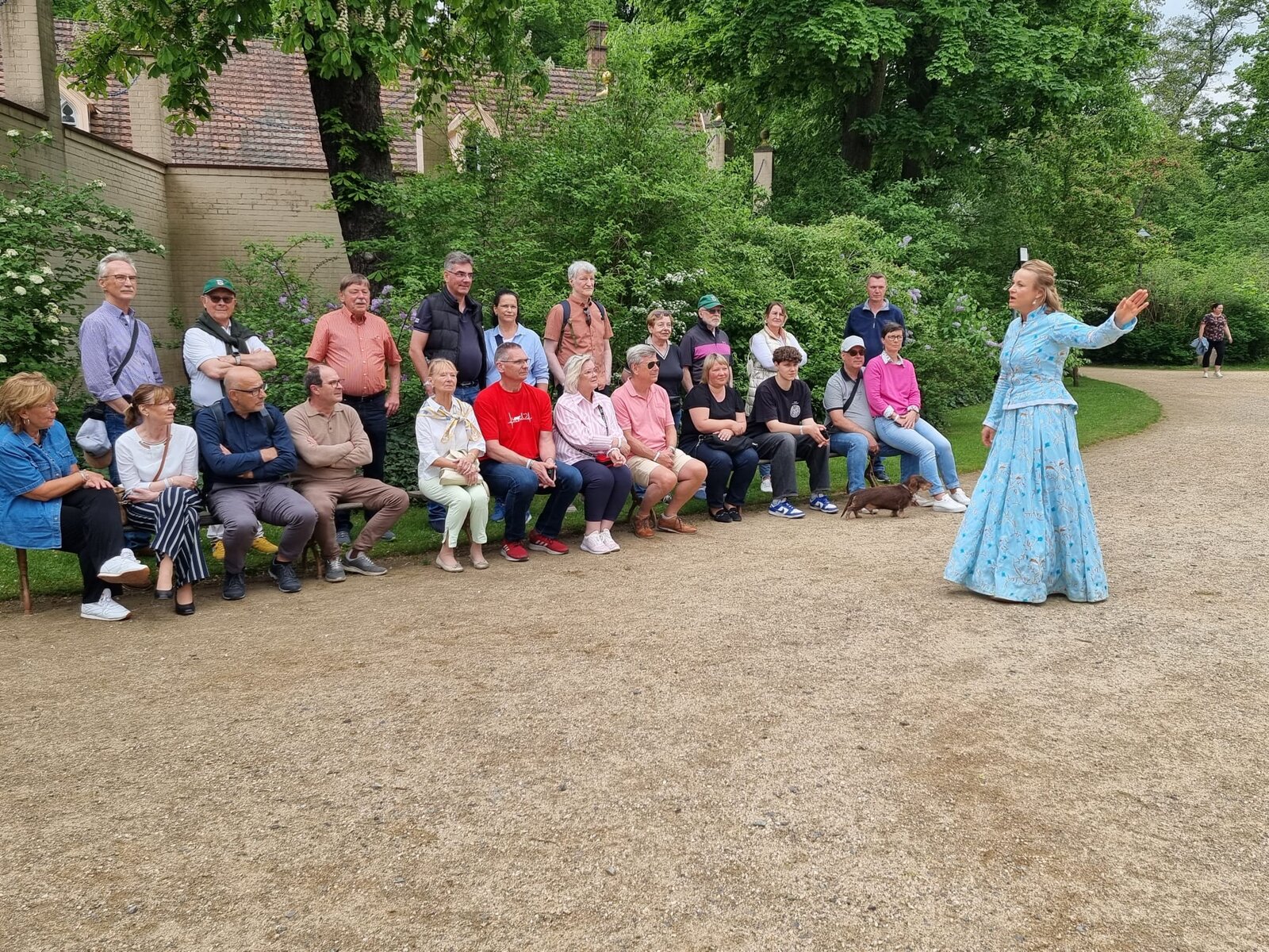 Aber wir müssen weiter! Das Roadbook führt uns zu Park und Schloss Branitz, wieder auf die Spuren des Fürsten Pückler. Wir beide haben uns mit dem Mk2 verfahren und so kommen wir verspätet als Letzte an. Sowas passiert, gelassen bleiben, ich übe mich darin, immer wieder. Ein Platz ist für Jag. auf dem privilegiert zu nutzenden Rasen frei gehalten. Die Wolken werden dichter und es wird wohl bald regnen. Vor dem Schloss warten wir bei den ersten Regentropfen auf unsere Führerin zur anstehenden Schlossbesichtigung. Es erscheint eine Dame, unerwartet in der Garderobe des 19ten Jahrhunderts gekleidet und stellt sich vor. Sie sei Lucie von Hardenberg, die Angetraute des Fürsten Pückler. Sie wird uns bei unserer Schlossbesichtigung durch die zeitgerecht eingerichteten Räume führen. Sie verrät uns Intimes ihrer Ehe und auch so manche Legende, die sich um ihr fürstliches Leben rankt.