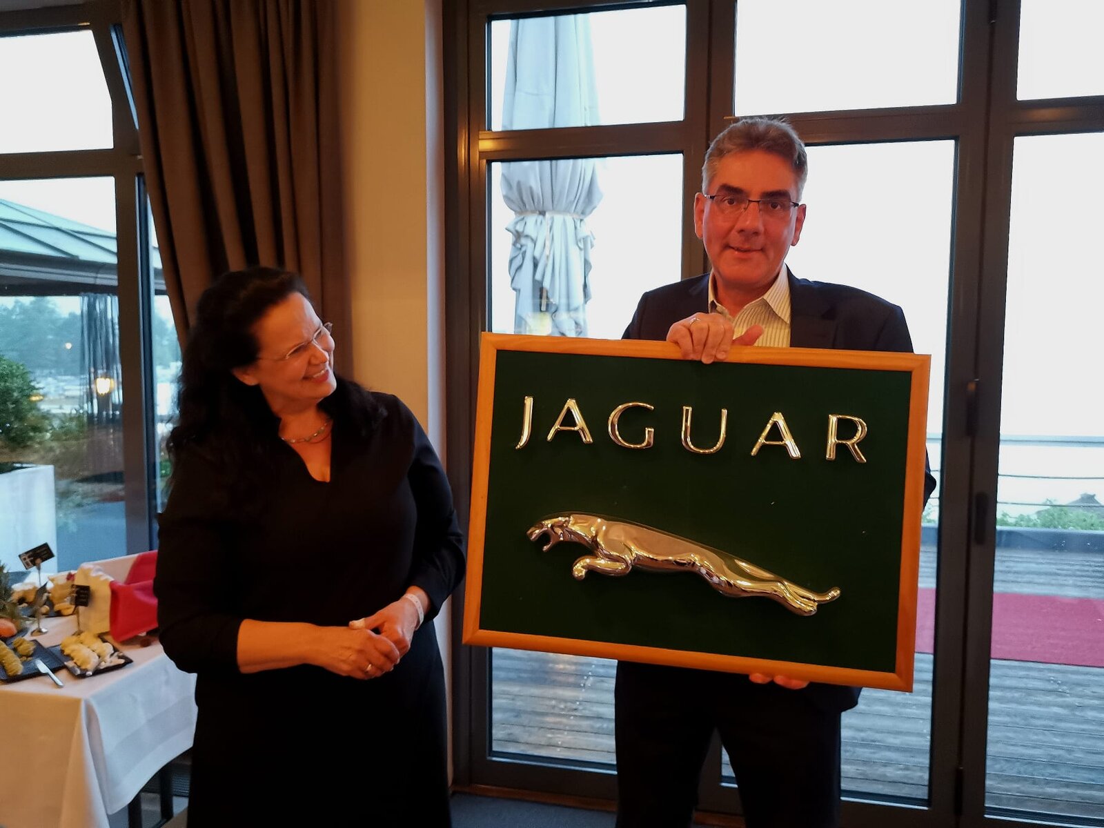 Unter Beachtung des Dresscodes „Business casual“ erreichen wir das im Bootshaus angerichtete Leuchtturm-Buffet. Der nun stetig schnürende Regen und der Blick auf das finstere, kabbelige Wasser des Geierswalder Sees, kann uns die Laune des letzten Abends dennoch nicht nehmen. Inzwischen sind die Ergebnisse der kleinen Wettbewerbe und Fragebogen von Jeannine und Christoph ausgewertet worden und wir sind gespannt auf die Siegerehrungen. Das Ergebnis: dritter Platz für die Familie Podkowa, tatkräftig unterstützt durch Sektionsdackel Leopold. Zweiter Platz für Familie Kosicki, und der erste Platz für das Team Bernd Riedel/Leo Paliot. Der ehemalige langjährige Sektionsleiter Bernd Riedel überreicht Christoph einen großen Bilderrahmen, der lange seine eigene heimische Wand geziert hatte. Auf racing-grünem Grund prangt chromblitzend unter dem klassischen Schriftzug JAGUAR der Leaper. Ein tolles Geschenk!