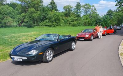 Aber von Beginn an. Letztendlich waren wir 12 Teilnehmer*innen mit 5 Cabrios (E-Type, XJ-S, XK8, XKR) und einem Coupe (XK8). Und die Sonne strahlte! Ergo konnten wir das gesamte Wochenende offen fahren! Herrlich. Die Tour führte von Wächtersbach durch den Vogelsberg, den Knüllwald - hier die erste Übernachtung -, das Waldeckerland und das Weserbergland bis Hameln. Als Straßen wurden diesmal hauptsächlich Bundesstraßen ausgewählt. Wer jedoch nun meint: "O nein - Autobahnen ohne Überholmöglichkeit, aber mit Traktoren....", nein, sobald man das Rhein-Main-Gebiet verlässt und etwas abseits der größeren Städte bleibt, sind diese Straße a) in der Regel gut ausgebaut und b) bei weitem nicht so dicht befahren wie im südlichen Hessen! Es ging also richtig schön voran und wir konnten die Etappen sehr genießen.