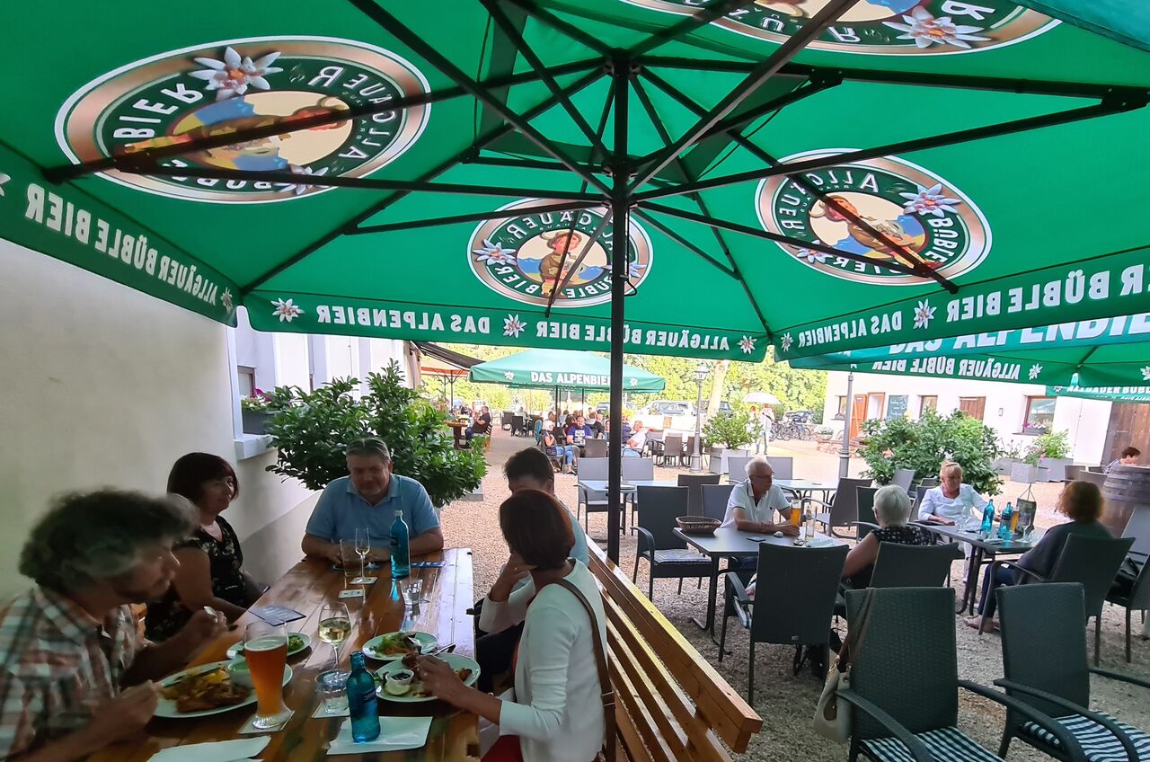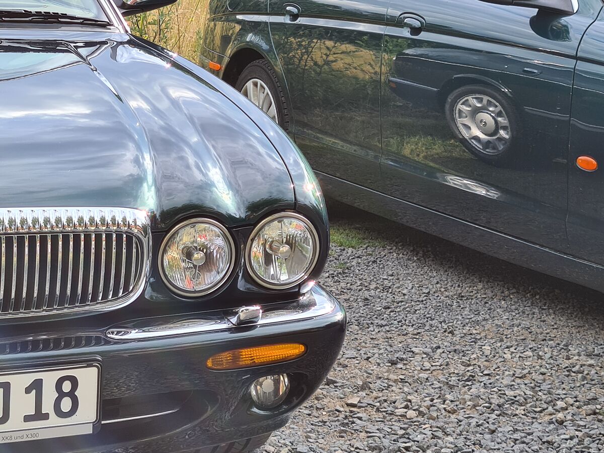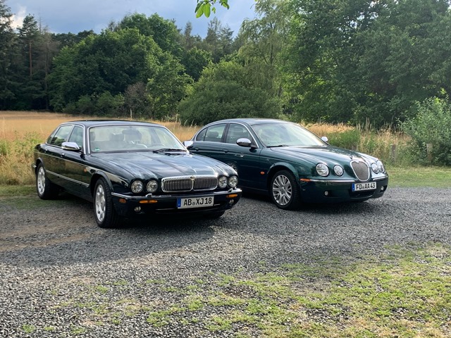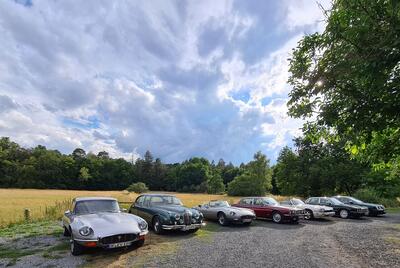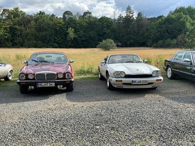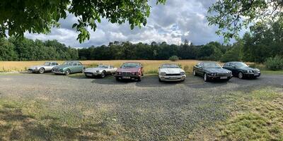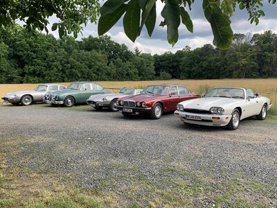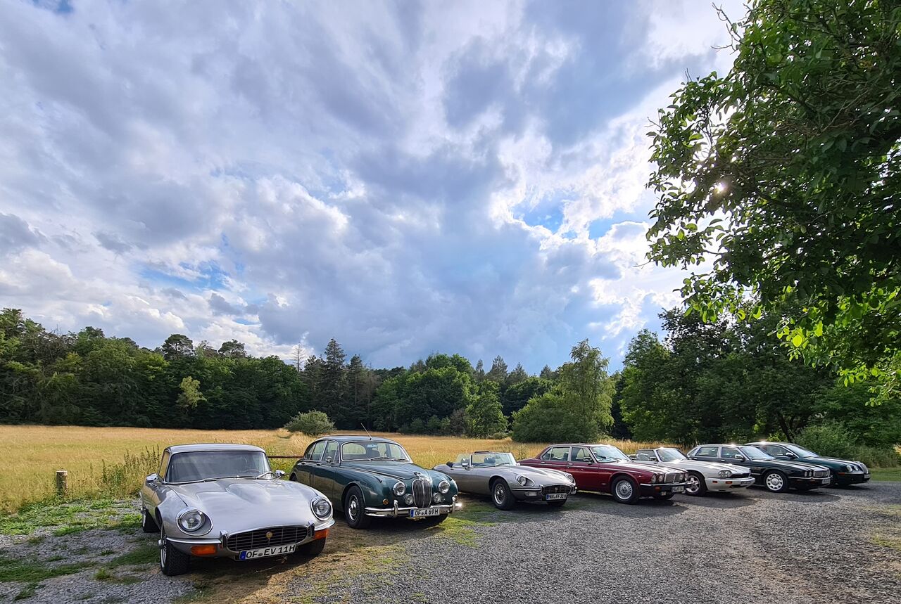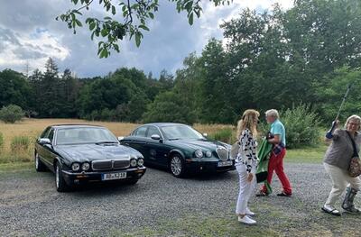 Vor dem Gasthof zeigte eine beachtliche Reihe von Jaguar-Fahrzeuge die Produktpalette der 1970er bis 2000er Jahre. Das Wetter spielte mit, also waren die vorreservierten Tische schnell gefüllt. Drei Gäste waren gekommen, um unsere Gemeinschaft zu beschnuppern.