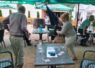 Leider zwang uns ein Wolkenbruch dann doch, ins Innere des Lokals zu gehen. Aber der Stimmung tat das keinen Abbruch. Berichte von gelungenen Reparaturen, Ausfahrten im kleinen Kreis und Vorfreude auf kommende Veranstaltungen prägten die Unterhaltung.