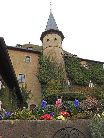 Nachdem wir die Autobahntrasse unter einer der Brücken - dem Bauwerk 91 der offiziellen Denkmalzählung - unterquert hatten, setzten wir die Tour steil abwärts ins Sinntal fort und eine halbe Stunde später erreichten wir bei Schlüchtern Burg Brandenstein. Diese Höhenburg, Ziel- und Endpunkt unserer Ausfahrt, ist auch heute noch im Besitz der Familie von Brandenstein-Zeppelin, zu deren Vorfahren der legendäre Luftschiffpionier, Graf Zeppelin, gehört, da seine Tochter Anfang des 20. Jhd. einen Brandensteiner heiratete. Hier wurden wir vom Burgvogt, dem Verwalter des Anwesens, herzlich empfangen und sogleich mit Blechkuchen und heißem Kaffee versorgt, da in diesen Tagen „der Schlehenwinter“ sein frostiges Gesicht zeigte, also jetzt die Zeit sei, wo die Schlehen - der Schwarzdorn - blüht, zeitgleich aber, wie an diesem Tag mehrfach erlebt, es auch noch schneien kann.