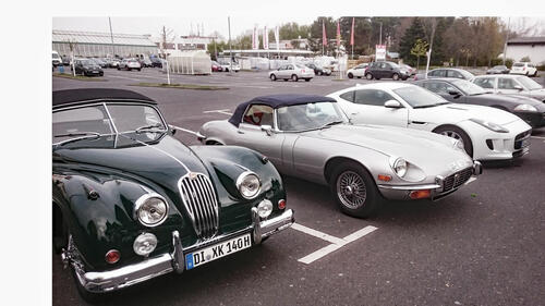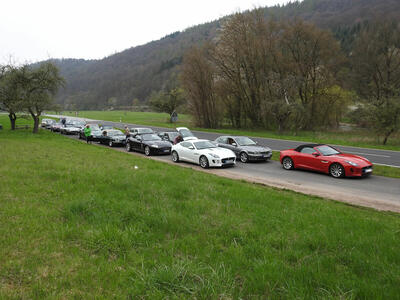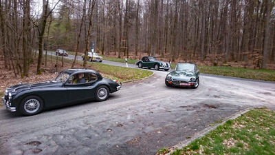 Am bereits mehrfach genutzten Start- und Treffpunkt, bei McDonalds im unterfränkischen Alzenau, fand sich an einem zwar kühlen aber zunächst sonnigen April-Samstagmorgen 2019 eine erkleckliche Anzahl schöner Fahrzeuge aus dem Hause Jaguar ein, darunter allein zwei XK 140 in offener und geschlossener Ausführung, neben verschiedenen Jaguar E und vielem mehr.
