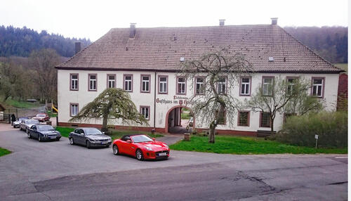 Kurz vor Mittag war dann die bereits oben erwähnte Lichtenau - das „Gasthaus im Hochspessart“ - erreicht. Hier fanden unsere Fahrzeuge im Innenhof und die Teilnehmer in der großen Wirtsstube Platz. Mit ortstypischen Spezialitäten wie Wildschweinschinken und Rehmedaillons vom Wild aus den angrenzenden Wäldern oder Forelle aus der am Haus vorbeifließenden Hafenlohr, wurde die Mittagsrast genussvoll verbracht, bevor dann, nach dem abschließenden Kaffee, wieder die Fahrzeuge bestiegen und gestartet wurden.