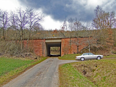 In Gräfendorf verließen wir dann in nördlicher Richtung das Tal der Fränkischen Saale und steil aufwärts ging es durch den Wald über eine schmale und einsame Landstraße, bis zum Parkplatz Rhönblick, wo sich die Teilnehmer sammelten, denn hier gab es Erläuterungen zum längsten bayrischen Denkmal, der Autobahnruine Strecke 46. Zwischen Bad Brückenau und Gemünden am Main finden sich auch heute noch verschiedenste Autobahnbrücken, Unterführungen und viele weitere Bauwerke, die scheinbar funktions- und zusammenhanglos einsam in den Wäldern stehen. Es sind die Relikte einer seit 1937 gebauten Reichsautobahn, der sogenannten Strecke 46, die nach dem 2. Weltkrieg zugunsten der heute weiter östlich verlaufenden A 7 aufgegeben wurde und deren Bauwerke heute als Zeugnisse frühen Autobahnbaus unter Denkmalschutz stehen. Die Trasse dieser nie vollendeten Autobahn ist auch heute noch anhand der unterschiedlichen Färbung der Bäume gut in der Satelliteneinstellung von Google Earth zu verfolgen.