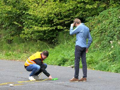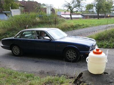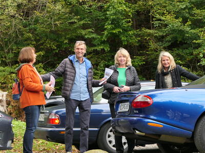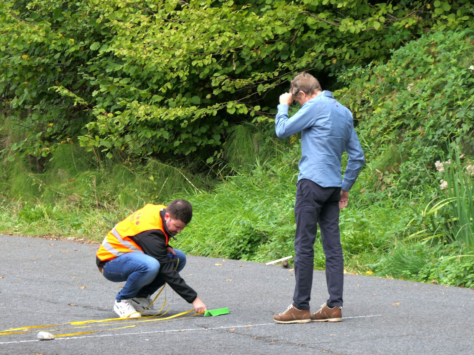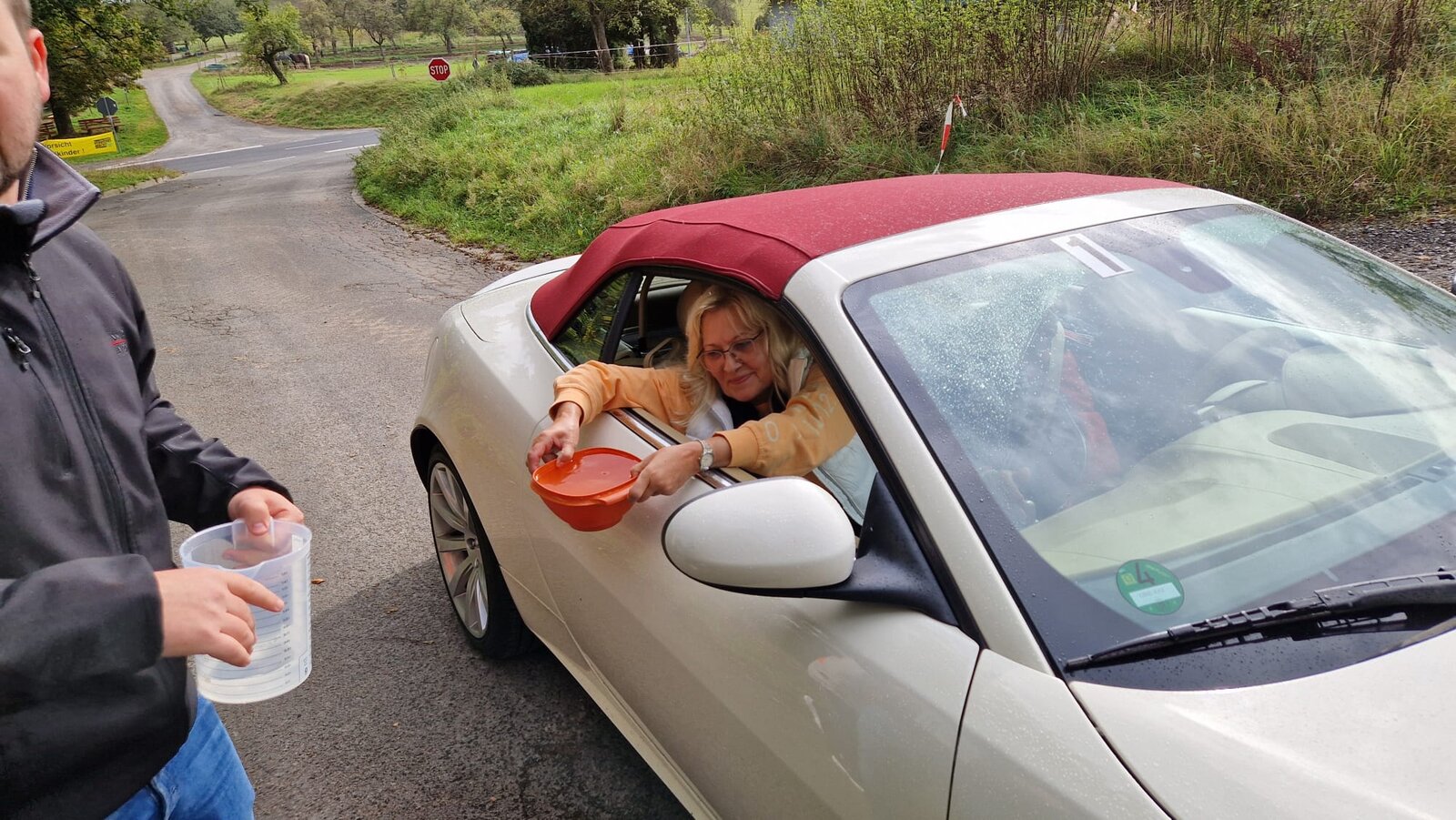 Beim Zwischenstopp am Nachmittag kamen auf einem Wanderparkplatz wieder Thommy und Suse zum Einsatz. Hier musste eine randvoll gefüllte Wasserschale mit möglichst wenig Wasserverlust über einen holprigen Waldweg gefahren werden. Vorzugsweise wurde die Schüssel vom Beifahrer/in außerhalb des Fahrzeugs gehalten. Und der Fahrer/in wurde gefragt, wo der Rückfahrscheinwerfer des eigenen Fahrzeugs war, hinten rechts, links, mittig oder beidseitig. Auch hier patzten erstaunlicherweise Fünf von Zwölf.