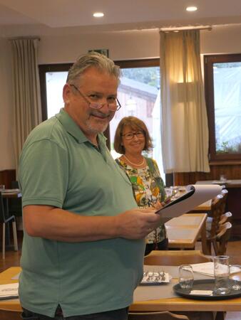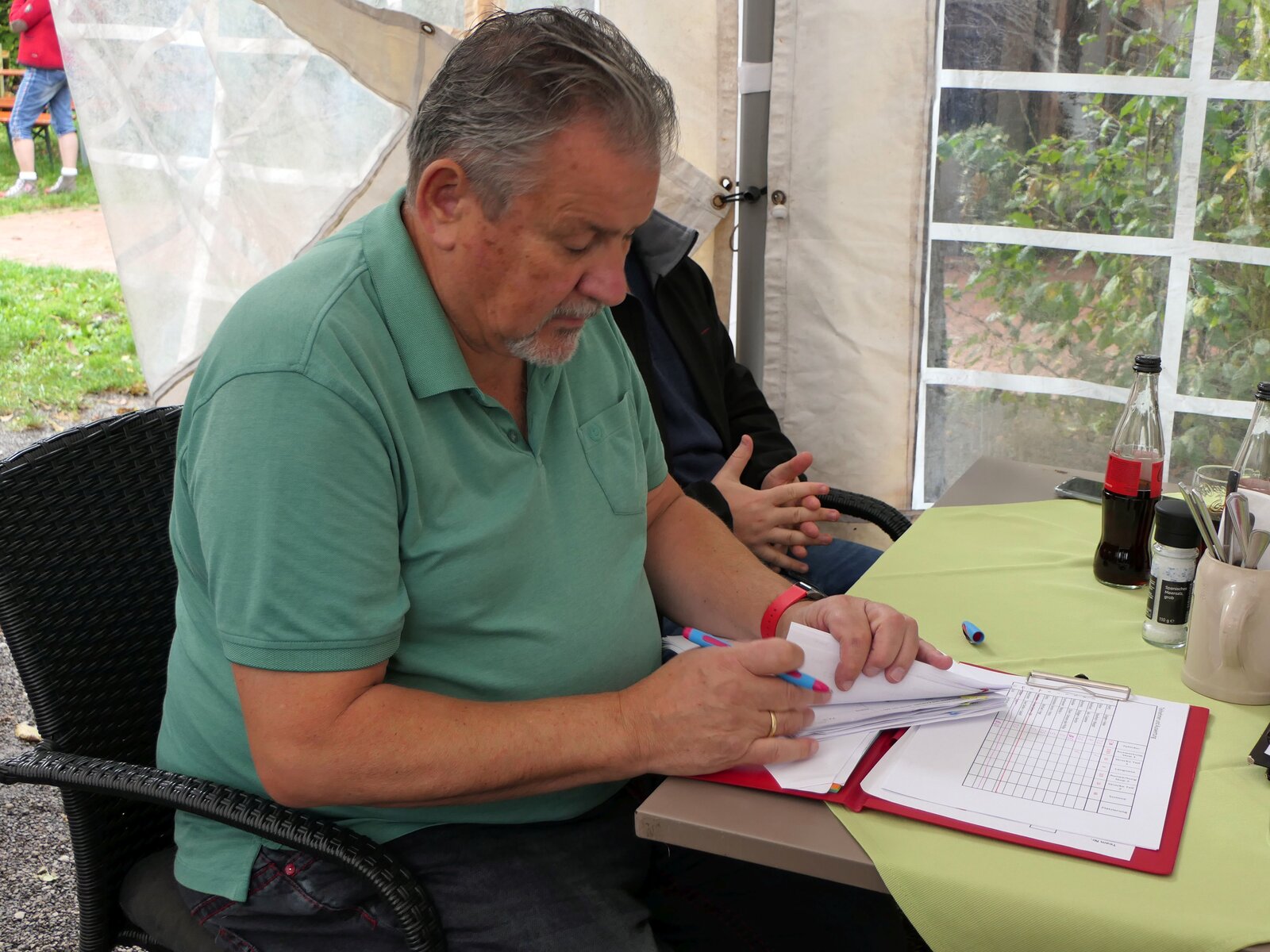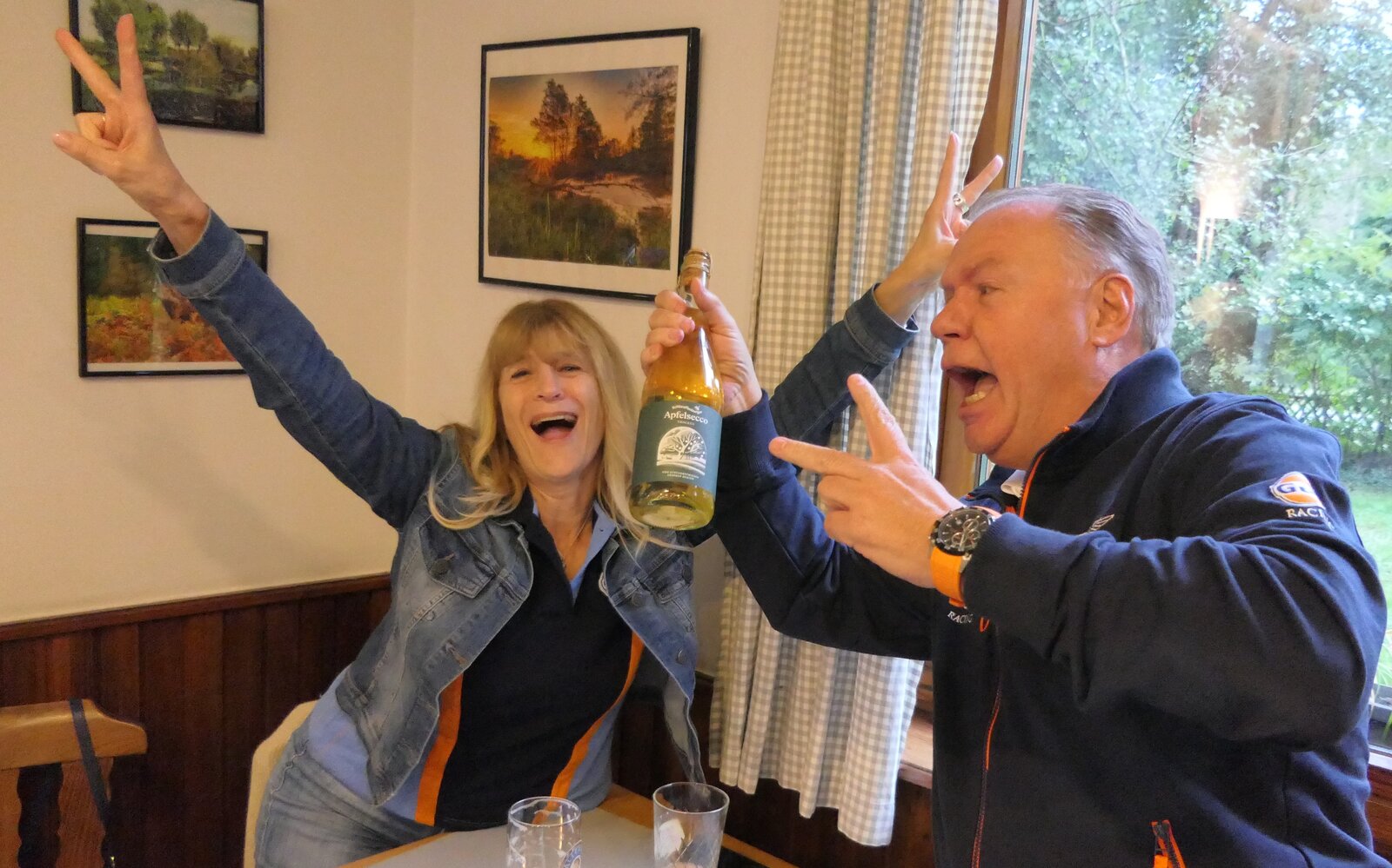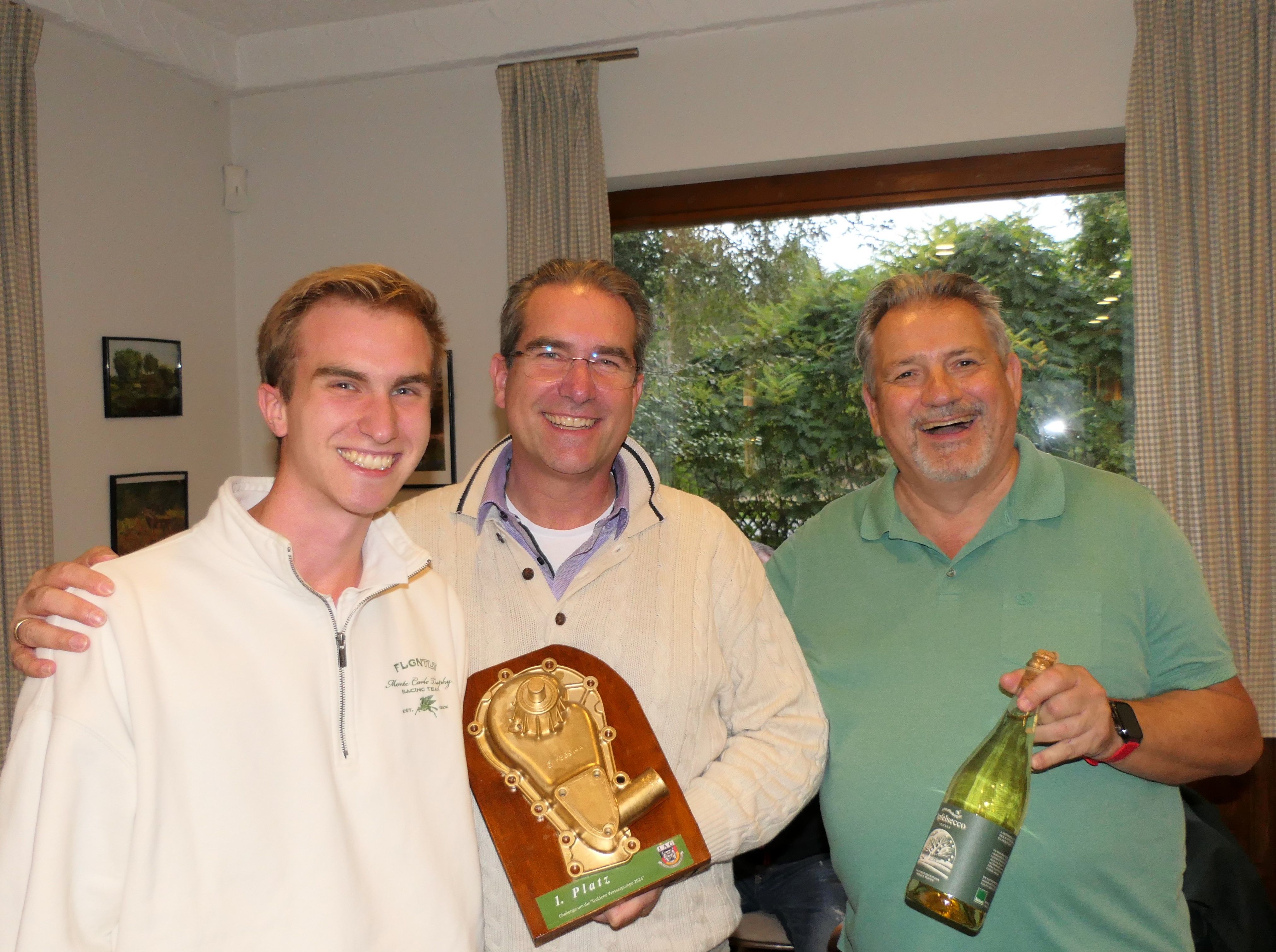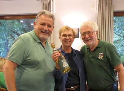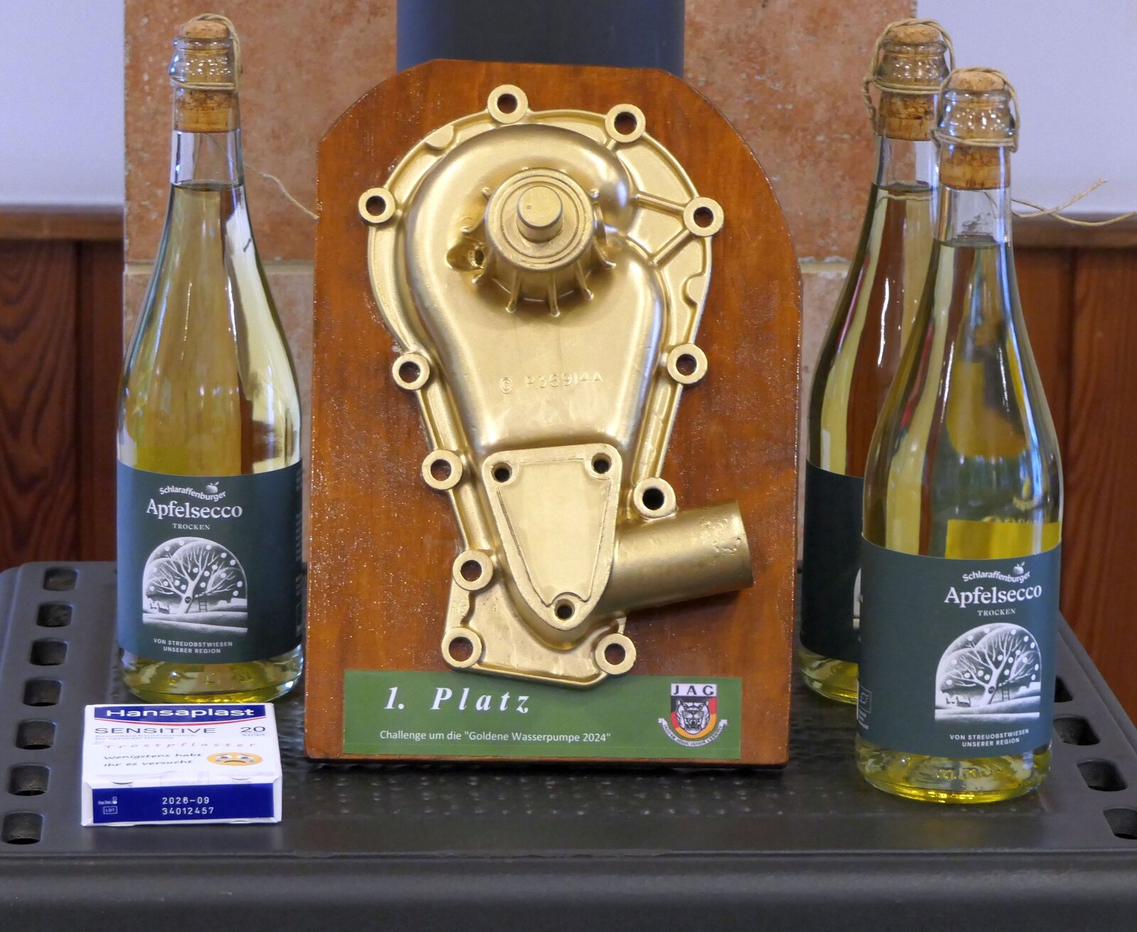 Dann endlich wurden die Goldene Wasserpumpe und der Spessart-Champagner in Form von Apfel-Secco von Streuobstwiesen an die drei Erstplatzierten überreicht. Die Goldene Wasserpumpe, der erste Preis, ging an Oliver und Sohn Philipp Weckler. Der zweite Platz ging an unseren Präsidenten Rüdiger und Kerstin Bonneß und der dritte Preis wurde Petra und Armin Schickedanz überreicht.
