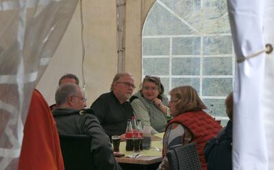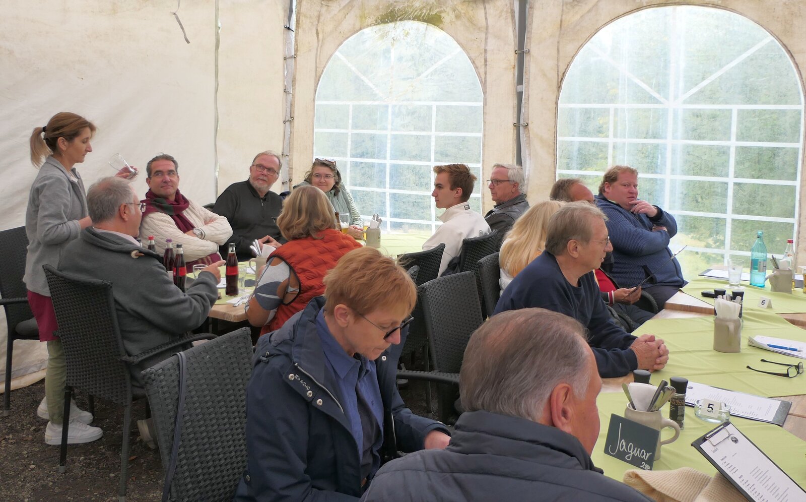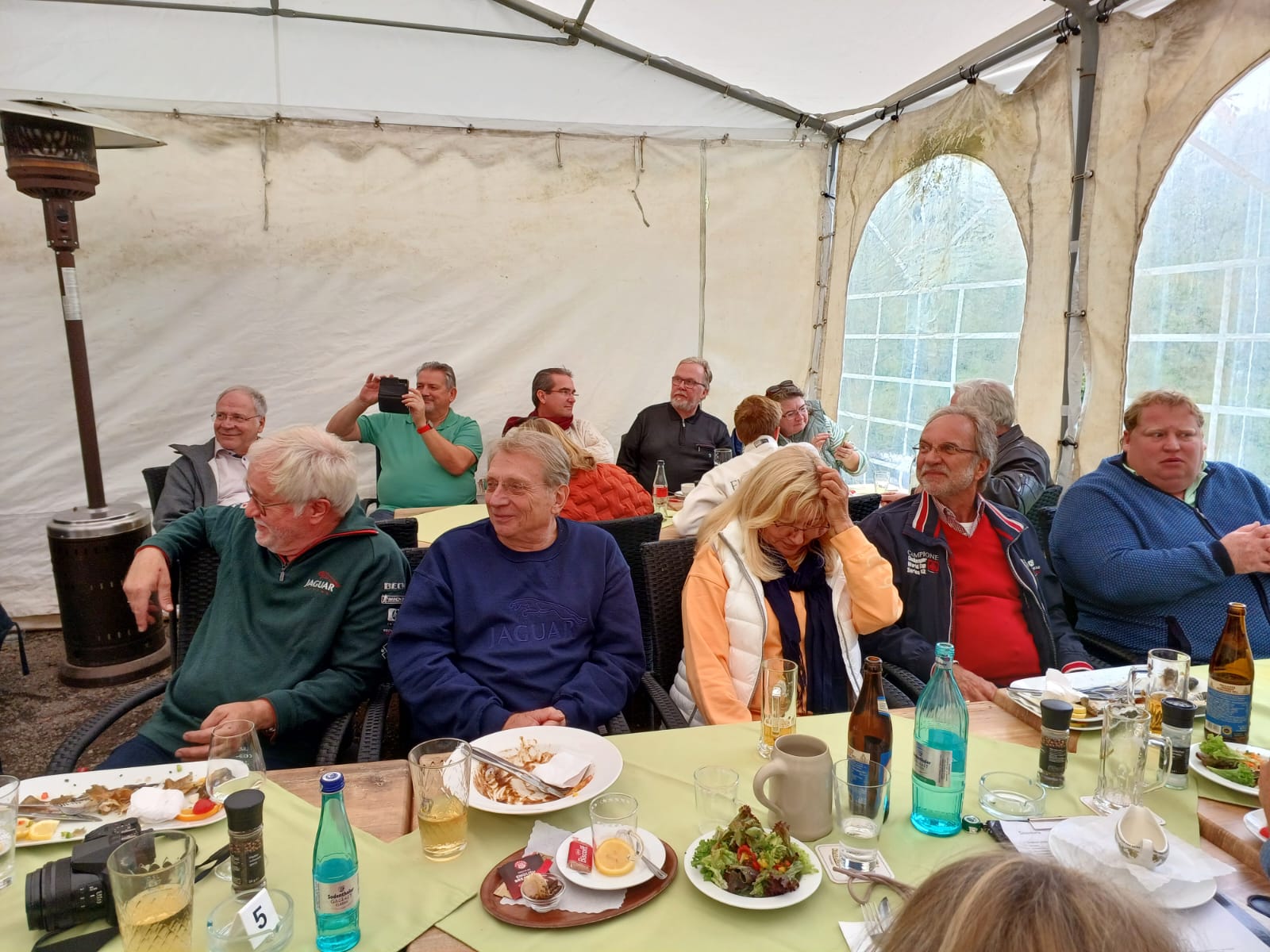Bei der Weiterfahrt durch den schönen Spessart, vorbei am geographischen Mittelpunkt der EU, mussten weitere Aufgaben gelöst werden, bevor dann die Mittagsrast in der Fischerhütte in Habichsthal auf die Teilnehmer wartete. Der Wirt hatte extra Platz geschaffen, damit unsere schönen Autos an seiner Fischerhütte parken konnten. Obwohl wir fast 30 Personen waren und wir á la carte wählen konnten, kam das Essen fast zeitgleich und in hervorragender Qualität.