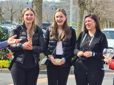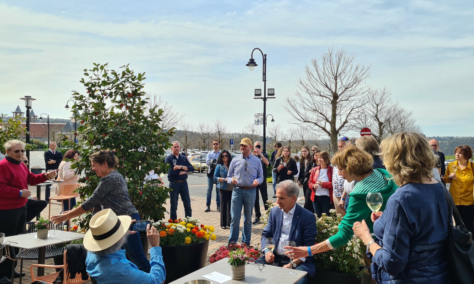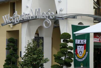 In Wertheim Village angekommen, hatte der Betreiber bereits einen Empfang mit Champagner organisiert. Unter dem großen JAG-Banner wurden sektionsübergreifend erste Kontakte geknüpft. Wer Lust hatte, konnte auch einfach beim Auto bleiben und mit anderen fachsimpeln. Das Mittagessen brachte alle wieder zusammen. Qualitativ gut, erforderte allerdings die zu geringe Zahl an Servicekräften und die beschränkte Kapazität der Küche Geduld. Ein Teilnehmer wollte seine Pizza „Quattro Formaggi“ schon als Käsekuchen zum Kaffee umdeklarieren…