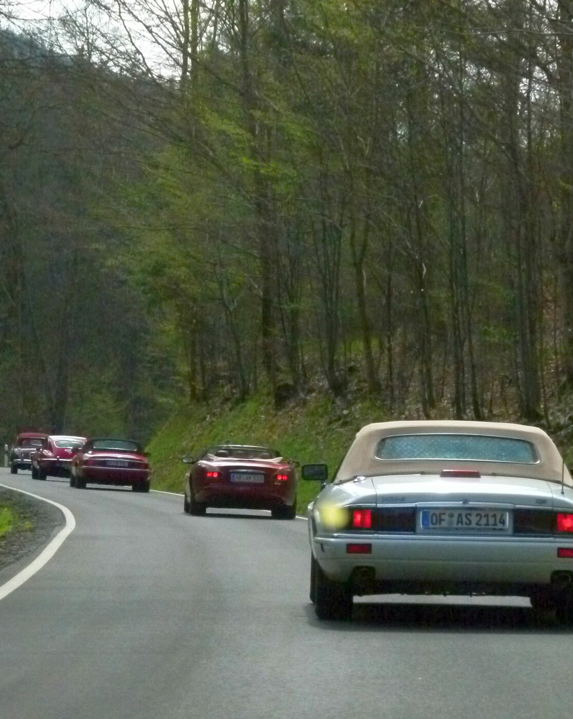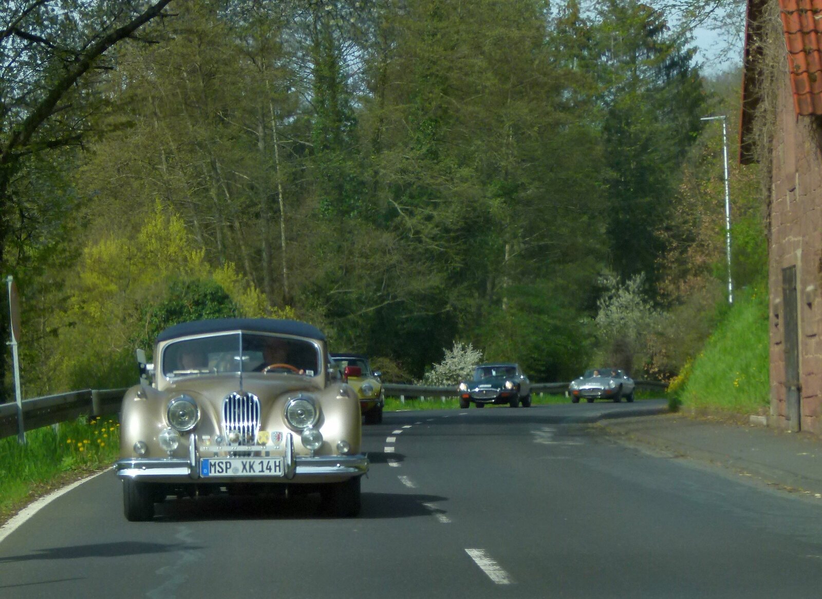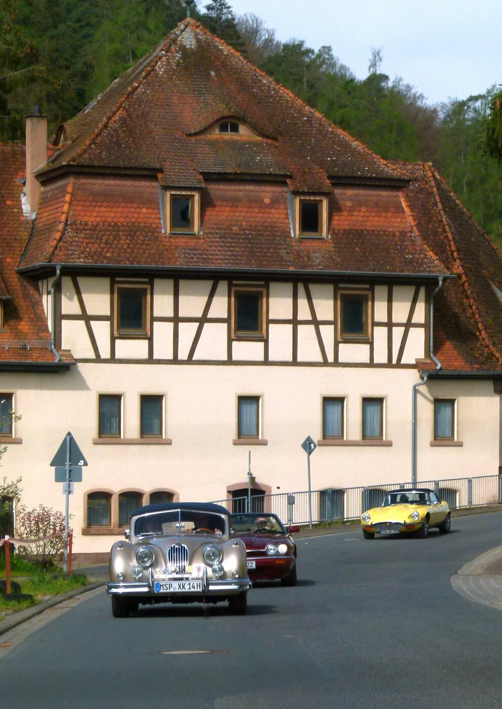 Die Strecke führte meist auf kleinen Nebenstraßen durch die Wälder des Spessarts. Das gute Wetter macht es den Cabriofahrern möglich, das Verdeck unten zu lassen, um Licht, Luft und Landschaft zu genießen. Aus den Spessarthöhen ging die Strecke hinunter ins Hafenlohrtal, das mit Bach und Wiesen einen besonders anheimelnden Eindruck bot. Zumindest aus touristischer Sicht war es gut, dass die Pläne zum Bau eines Wasserspeichers hier nie umgesetzt wurden. Ab Marktheidenfeld wechselten die Teilnehmenden auf die andere Mainseite, um direkt am Main entlang Richtung Wertheim zu cruisen. Auf der einen Seite der Straße lagen die Weinberge im Sonnenlicht, auf der anderen Seite floss der Main. Das war Landschaftsgenuss pur in unseren wunderbaren Autos.