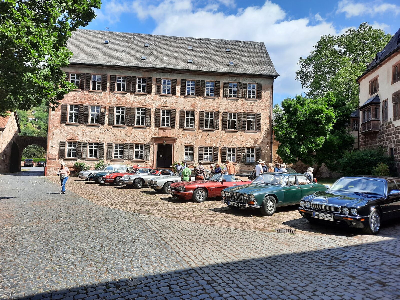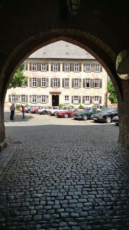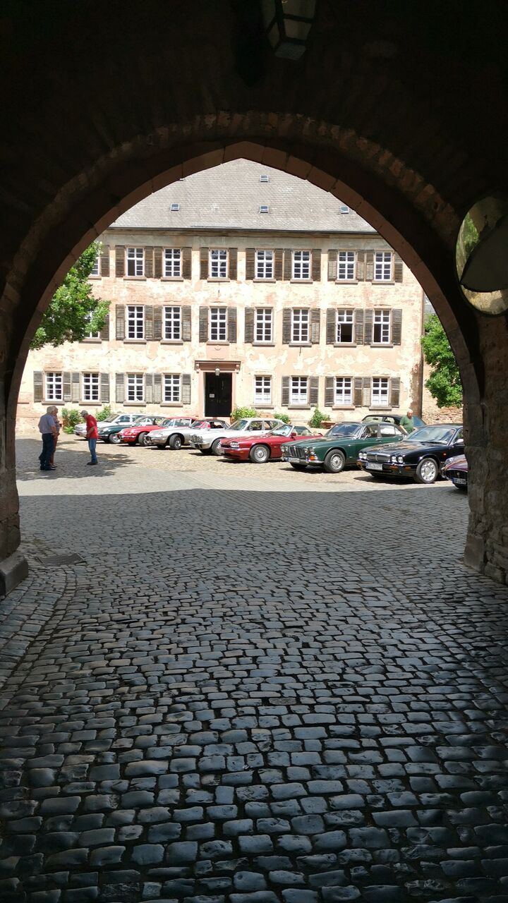 Mittagsziel: Das Schloss in Büdingen! Eine Altstadt, bei deren Durchfahrt auf altem Katzenkopfpflaster man sofort an Kutschen, offene Essen der Schmiede und emsiges Handwerkstreiben erinnert wird. Wir dürfen in den Schlosshof fahren und unsere Fahrzeuge prominent und exklusiv aufstellen. Und das Mittagessen: schmackhaft, durch Vorbestellung trotz anderer größerer Gesellschaften schnell auf den Tisch gebracht, gut organisiert im Restaurant „Bleffe“. In einem alten Fachwerkhaus überrascht ein modernes Restaurant.