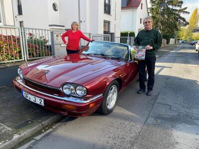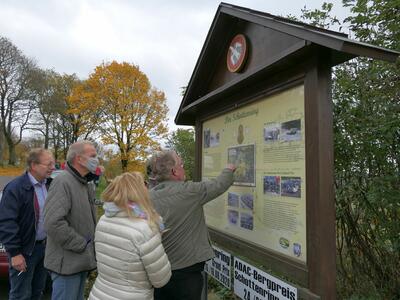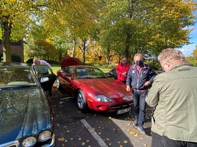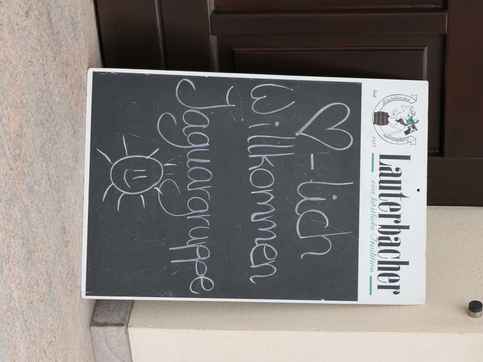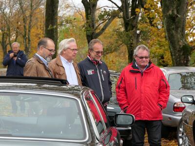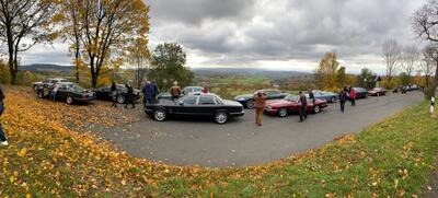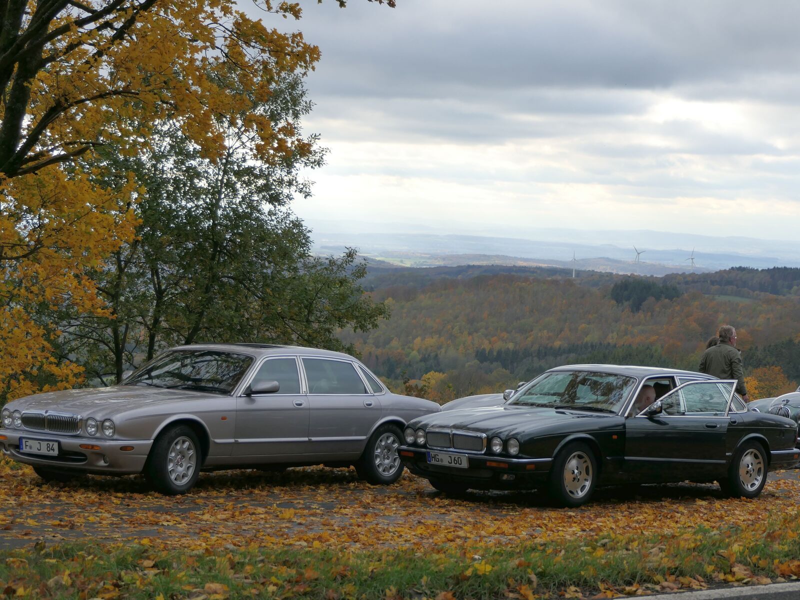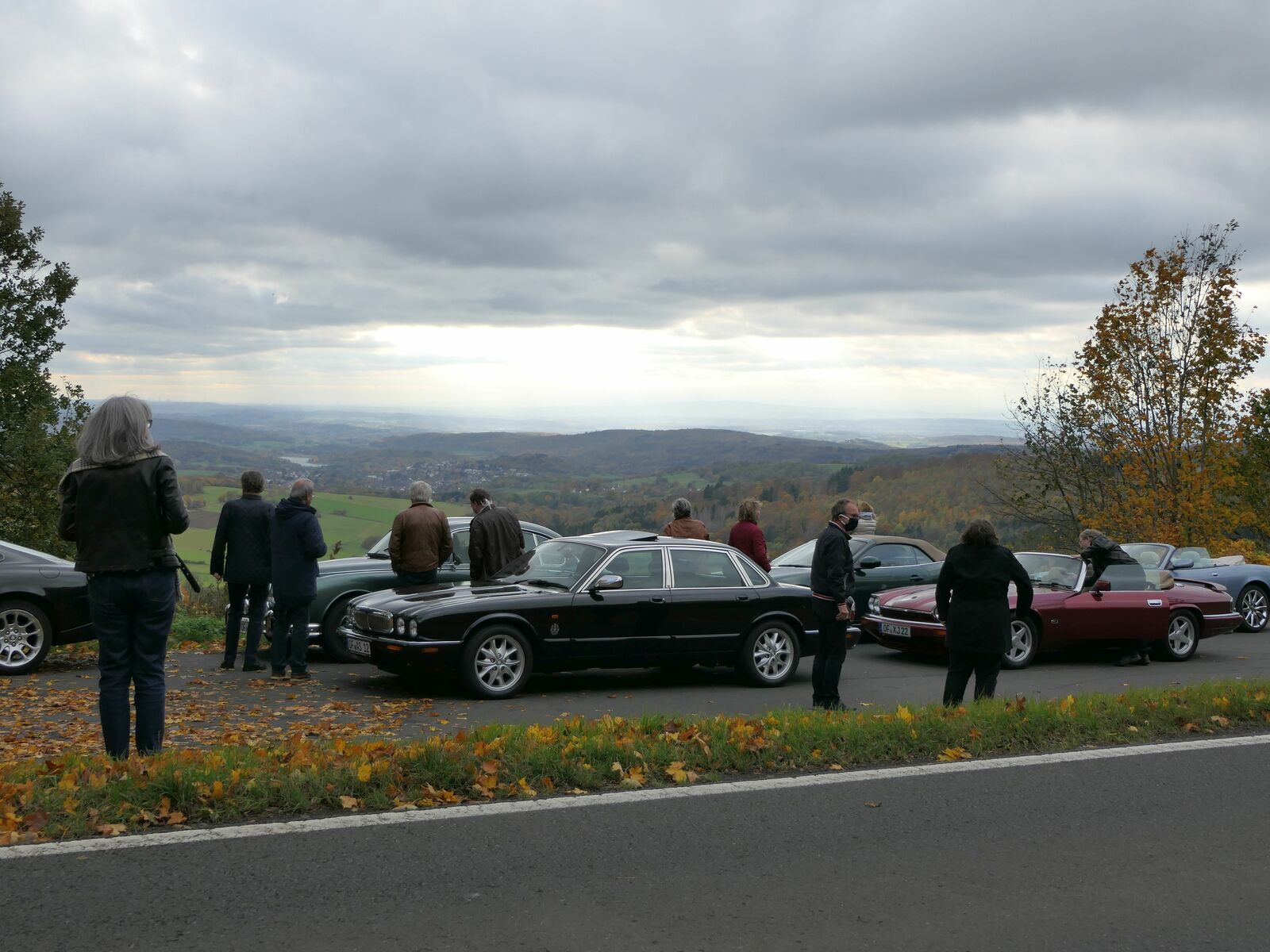 Aufwärts, Richtung der höchsten Vogelsberg-Höhen, war bald der von uns „Panorama-“ offiziell jedoch „Aussichtsparkplatz“ genannte Zwischenstopp erreicht, inzwischen mit 14 Fahrzeugen, da ein Jaguarfreund aus dem Kasseler Bereich noch zu uns gestoßen war. Hier bot sich nun tatsächlich eine großartige Weitsicht, diesmal herbstlich gefasst, bis zur Frankfurter Skyline, dazu einige Erläuterungen zur Motoradrennstrecke „Schottenring“ auf dem wir uns die letzten Kilometer bewegt hatten und zu einer Bank die mit einem Schild geschmückt ist, das auf den Schottischen Dichter des späten 18. Jhrd. hinweist, Robert Burns, die ein Freundeskreis des Dichters, zu dem auch JAG-Mitglieder gehören, hier aufgestellt hat und an der, am Geburtstag des Poeten im Januar, man sich trifft und mit Whisky auf ihn anstößt. Weiter, vorbei am Hoherodskopf, zur Herchenhainer Höhe, wo die nächste grandiose Aussicht genossen wurde. Hier, gegen Ende unserer Ausfahrt, verabschiedeten wir uns von den Jaguarfreunden die nur an der Ausfahrt teilnehmen wollten, alle anderen fuhren weiter in ein örtliches Gasthaus, wo wir uns im Saal, mit dem in diesen Zeiten notwendigen Abstand voneinander versammelten.