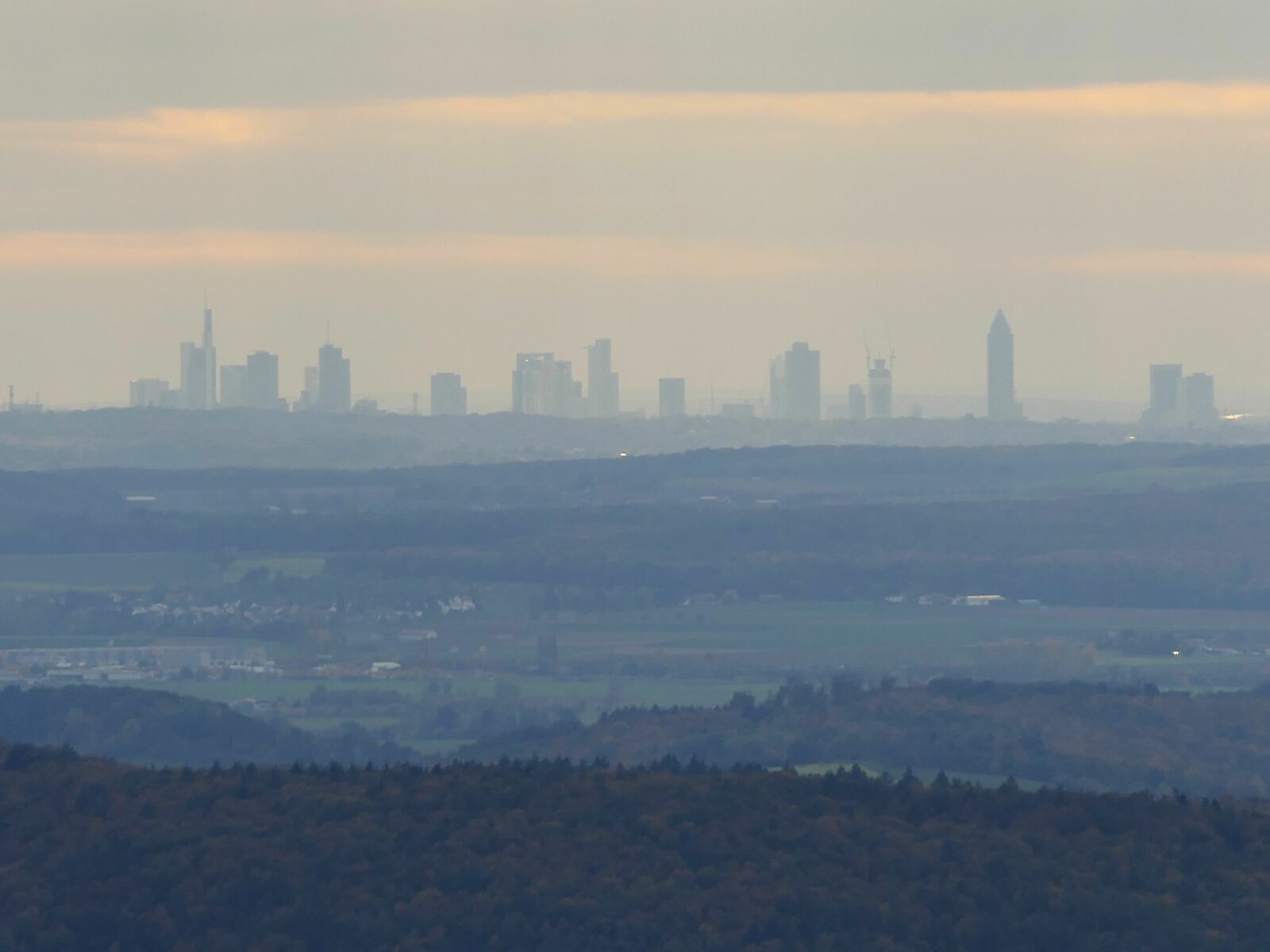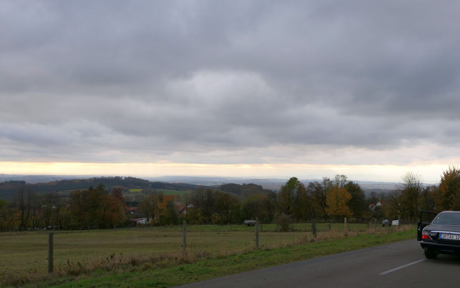 Ausbaldowert hatte ich diese Strecke bereits im Juni diesen Jahres, als ich an einem dieser wunderbaren langen Abende eigentlich nur eine kleine Abendrunde mit dem Cabrio durch die Wetterau machen wollte. Wie das dann so ist, ein interessantes Sträßchen folgt auf das nächste, an jeder Kreuzung locken Schilder zu unbekannten Orten, der Abend war lau, und so stand ich plötzlich gegen 22.00 Uhr unterhalb des Hoherodskopfs im Vogelsberg, auf dem Aussichtsparklatz, und mir stockte beinahe der Atem, denn in der zart rosafarbenen Weitsicht war ein Panorama vom Spessart bis zum Taunus zu sehen und mitten drin, in ca. 80 km Entfernung, die Frankfurter Skyline.