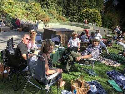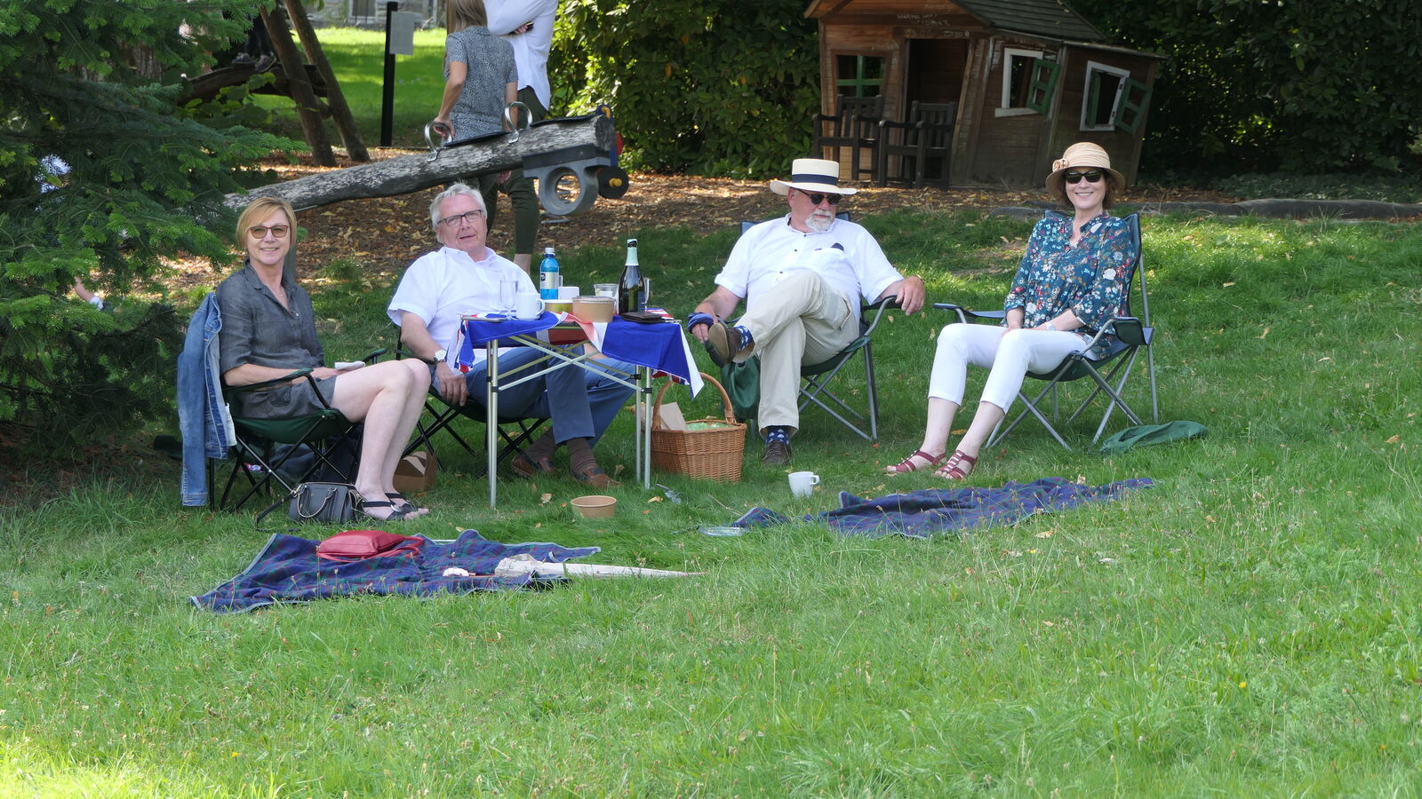 Im Schlosshotel Falkenstein war der Parkplatz reserviert, als die Kolonne eintraf. Picknickrucksäcke und eine Tüte mit leckerem Essen standen für die Teilnehmer(innen) bereit. Auf den ausgeteilten Picknick-Decken, dem hoteleigenem Gestühl oder mitgebrachten Camping-Möbeln nahm dann jeder Platz, um den wundervollen Blick auf die Mainebene mit der Silhouette der Stadt Frankfurt zu genießen. Die Sonne gab sich alle Mühe, die nötige Wärme zu spenden. Und als die leckeren Burger für uns frisch gegrillt waren, gab es noch ein kulinarisches Highlight.