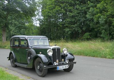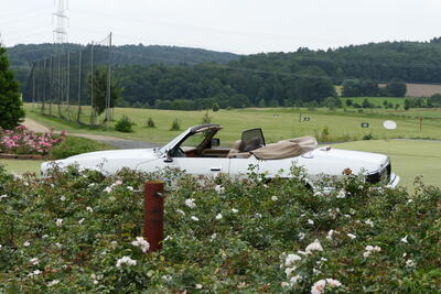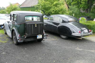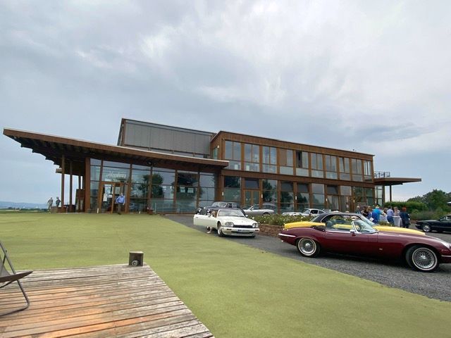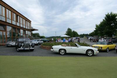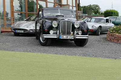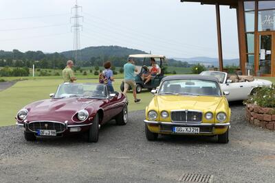 Weiter führte uns das Roadbook bis zum Schottenring, wo es an einem Panorama-Parkplatz mit Aussicht bis nach Frankfurt eine kurze Pause gab. Dort erwartete uns wie erwähnt Rüdiger Witzel samt Gattin mit seinem Daimler Fifteen Saloon. Auf dem letzten Streckenabschnitt bis zum Golfclub Wimmerod nahe Reiskirchen öffnete der Himmel seine Schleusen. Gar hurtig versuchten die Cabriofahrer die Verdecke zu schließen, um nicht pitschnass zu werden.