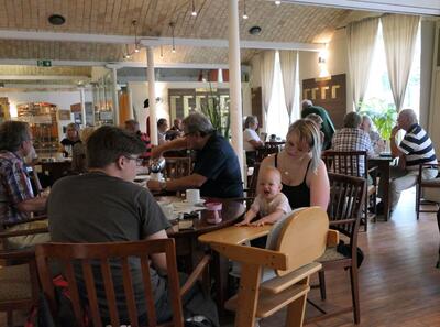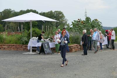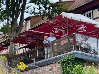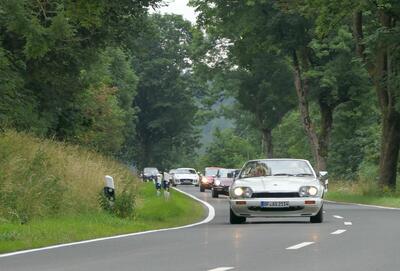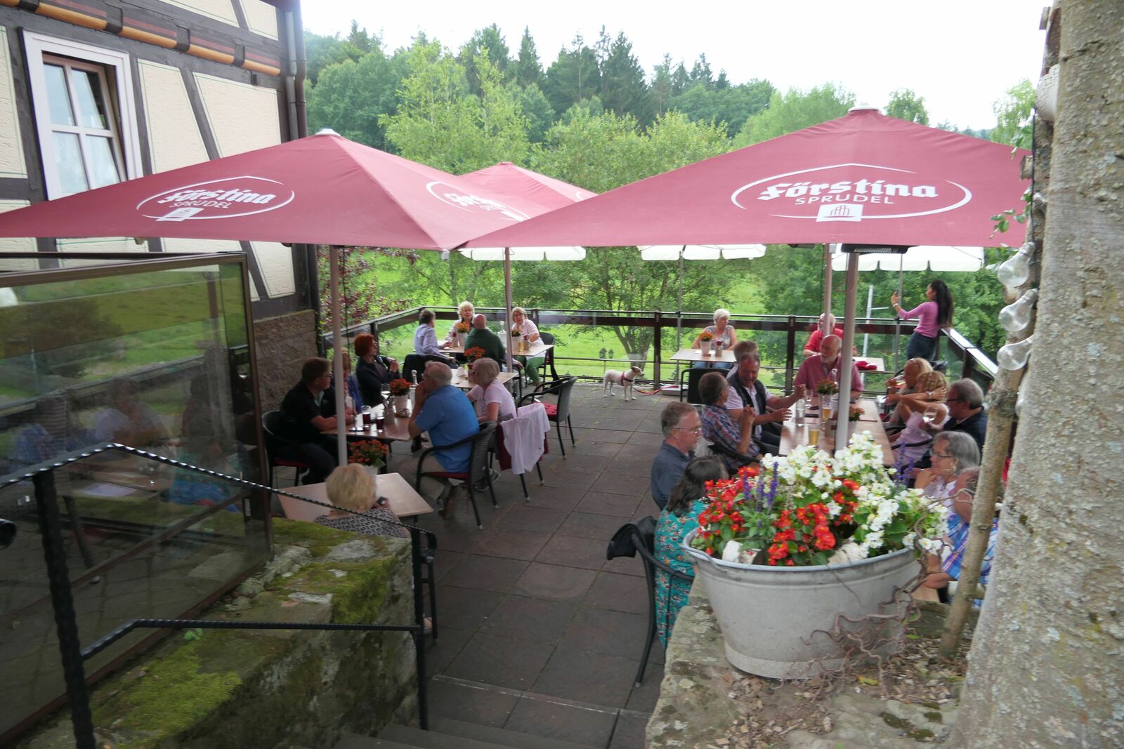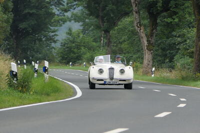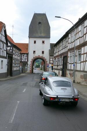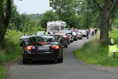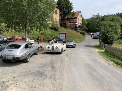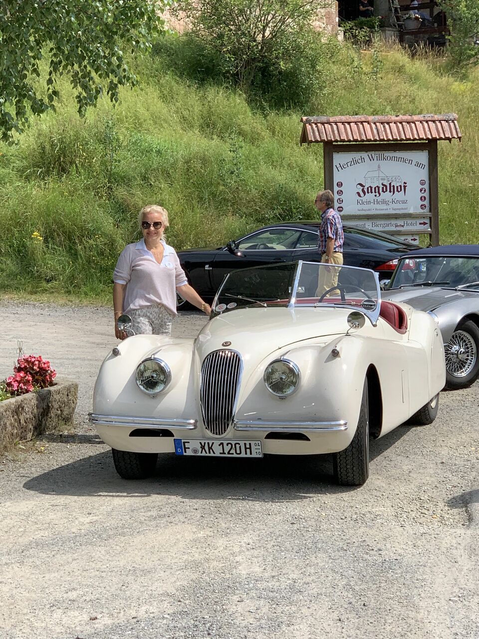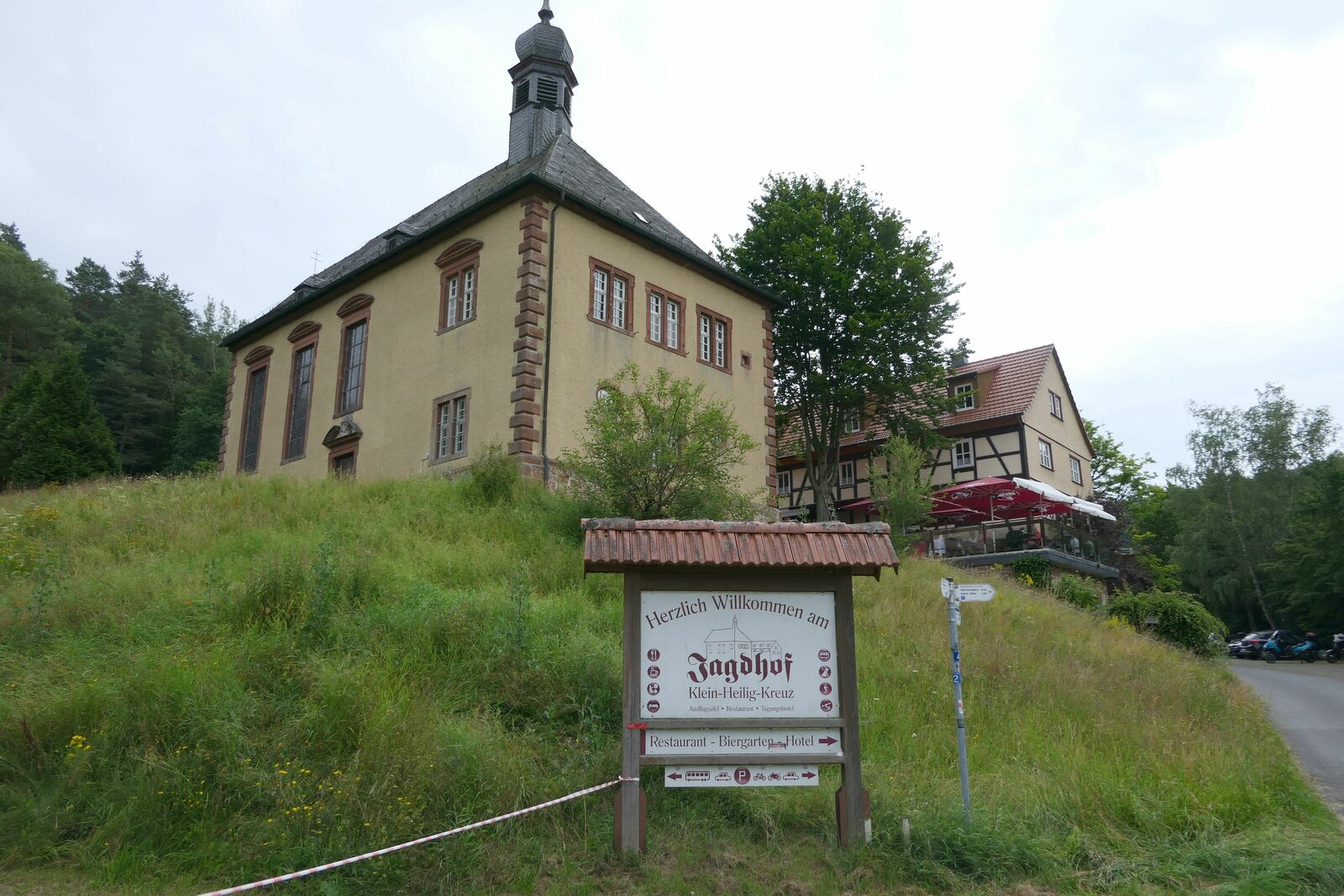 Der nächste Streckenabschnitt bot den Cabriofahrern einen kurzen Regenschauer. Die Strecke führte durch Nebenstraßen des Vogelsbergs bis kurz vor Fulda. Dort schlängelt sich die Lüder durch ein Tal. Die Orte haben entsprechende Namen wie Groß-Lüder und Klein-Lüder. Bescheiden wie wir Jaguarfahrer nun mal sind, begnügten wir uns mit Klein-Lüder. Dort steht am Ende eines Tales die Wallfahrtskapelle Kleinheiligkreuz, die bereits 1701 geweiht wurde. Der Hof und das Gelände um die Kirche herum gehört seit 1708 der Familie Wehner. Nach der Säkularisierung m Jahre 1805 ersteigerte die Familie auch die Kapelle. Viele Jahre diente sie als Scheune und Stall, bis die Familie Wehner 1850 eine Hauskapelle einrichtete. Erst 1913 wurde die Wallfahrtkirche nach Renovierung wieder geweiht. Unter der Kapelle für die innere Einkehr betreibt die Familie Wehner nach wie vor einen Gasthof für mehr weltliche Einkehr. Das Mittagessen auf der Terrasse bot die Gelegenheit, den Körper zu stärken, um fit für die letzte Etappe zu werden.