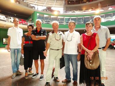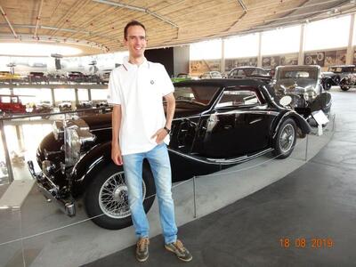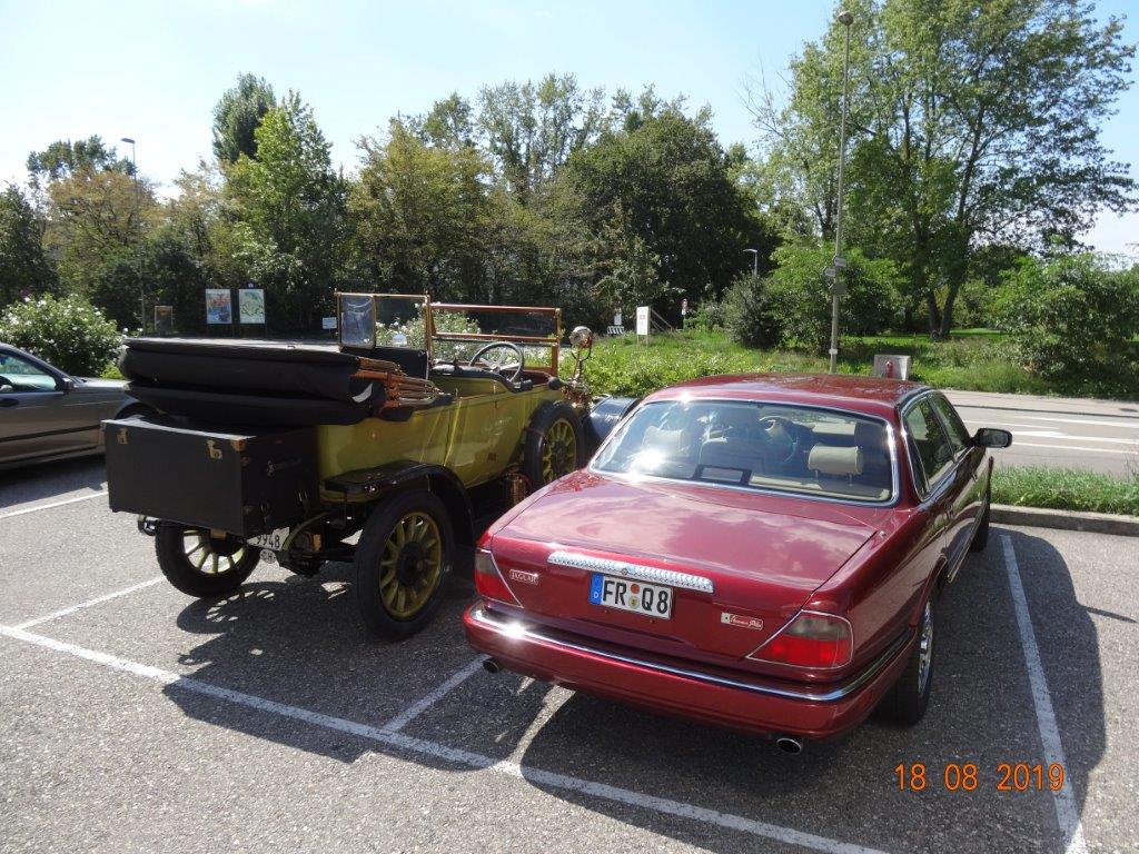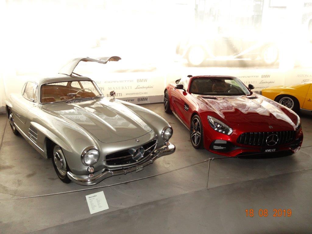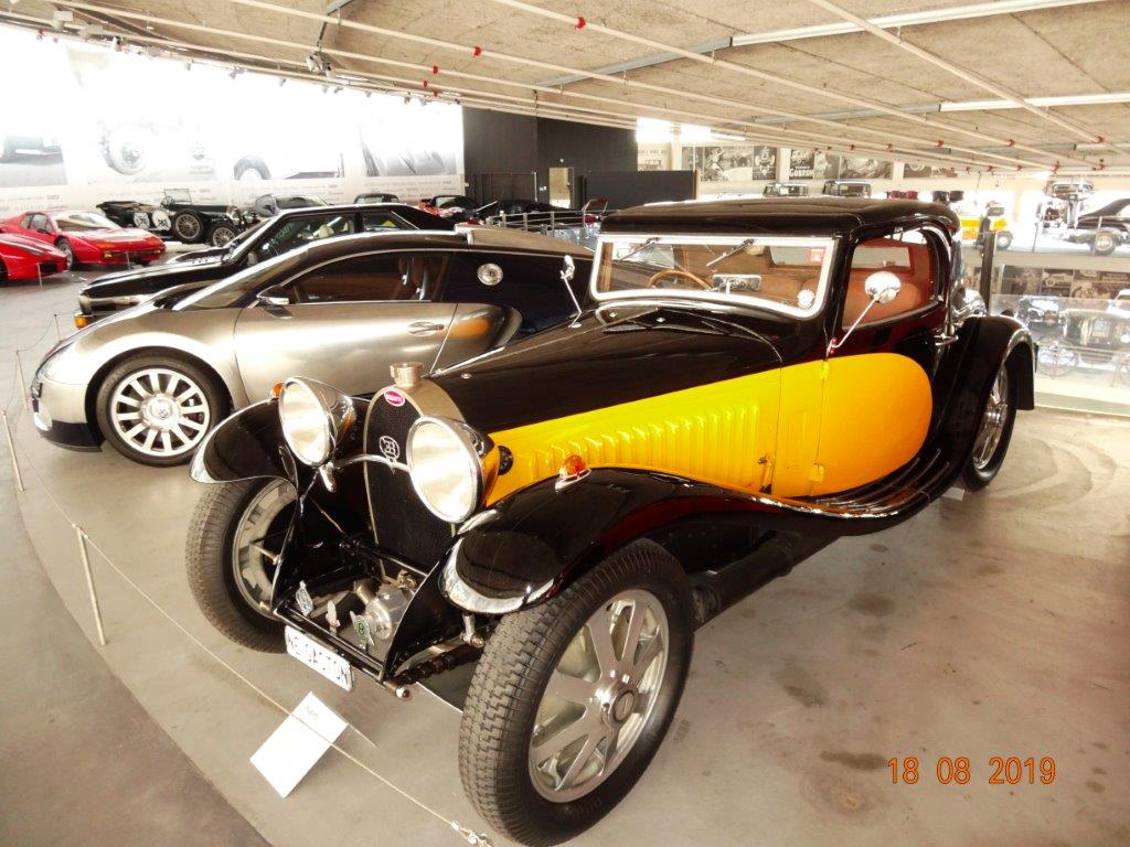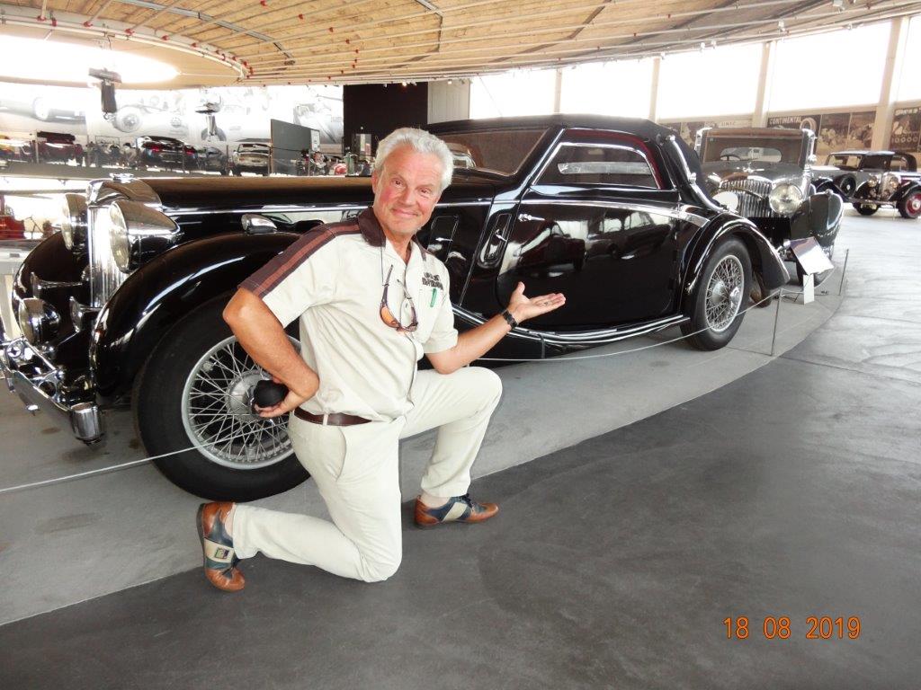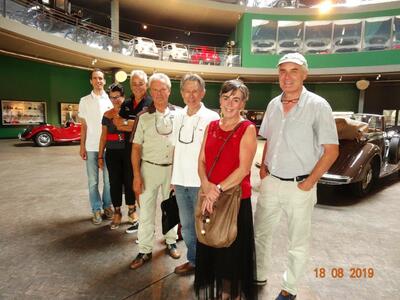 Der Tag versprach, heiß zu werden. Als Treffpunkt war 11Uhr auf dem Parkplatz des Biomarktes in Müllheim ausgemacht und unsere kleine Reisegesellschaft fackelte ob der schon ziemlich hohen Temperatur nicht lange, wer mit wem in wessen klimatisierten Automobil die Reise gen Basel antrat. Einfach den kürzesten Weg über die Autobahn zu nehmen, stand nicht zur Debatte. Zum einen, weil nicht jeder eine gültige Vignette hatte, zum anderen, weil Reiseführer Alexander sich echt Mühe gegeben hatte, auf beschaulichen Nebenstraßen unser Ziel zu erreichen: das Pantheon in Basel. Seinen Ursprung hat das Wort als Begriff für einen kuppelförmigen Tempel, in dem die alten Griechen ihren Göttern huldigten. Das Pantheon Basel – ein moderner Kuppelbau – dient heute als Museum, in dem Oldtimer-Liebhaber ihrer Leidenschaft frönen können. Das Rundgebäude beherbergt ein Restaurant, die Pantheon-Classic Garage mit ihren Dienstleistungen wie Vermietung und Verkauf von Oldtimern sowie Vermietung von Eventflächen, Boxen und Veteranen-Parkplätzen. Initiiert wurde der Umbau der ehemaligen Maschinenhalle Züblin vom Basler Unternehmer Stephan Musfeld, der einen Begegnungsort für Oldtimer-Besitzer, -Liebhaber oder –Interessierte schaffen wollte. Er ließ in die kreisrunde Halle eine Rampe einbauen, die sich spiralförmig nach oben windet und auf verschiedenen Ebenen großzügig Platz für die ausgestellten Automobile, Fahrräder etc. bietet. Bei dieser inzwischen 24. Sonderausstellung ging es Stephan Musfeld um die Gegenüberstellung von frühen Design-Klassikern bis zu den heutigen, hoch technologisierten und leistungsstarken Boliden. Von 14 Marken wird jeweils eine Design-Ikone und ein modernes Gegenstück vis-à-vis präsentiert – insgesamt also 28 Autos. Schnell waren die Cracks unserer Gruppe in Gespräche über Fortschritte der Technik und den Wandel des Designs in den letzten 90 Jahren vertieft, diskutierten über „Gefallen“ und „Nichtgefallen“ mit dem – Überraschung! – Ergebnis, dass dies im Auge des Betrachters liegt. Erinnerungen wurden geteilt, Begebenheiten erzählt, Bedauern über verpasste Kaufgelegenheiten oder veräußerte Lieblinge ausgetauscht, kurz: es kam keine Langeweile auf und jeder Einzelne auf seine Kosten.