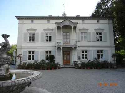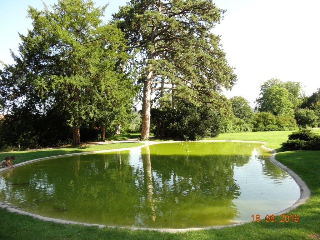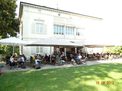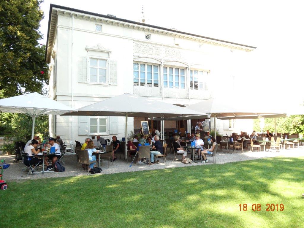 Nach einem kurzen Boxen-Stop im Museumsshop trommelte Alexander seine Schützlinge zusammen und eröffnete ihnen, dass nunmehr ein Fußmarsch zu den „nahe gelegenen Meriangärten“ auf dem Programm stünde, wo im Restaurant ein Tisch für uns reserviert sei. Bekanntlich haben die Götter vor den Erfolg den Schweiß gesetzt, so auch hier. Der Weg führte zunächst durch stille Vorstadt-Wohngebiete mit aufgeräumten Gärten und schmucken Häuschen, die – für die Schweiz typisch – bauzeitentsprechend und behutsam renoviert waren. Auf der Suche nach Schatten wechselten wir immer wieder die Straßenseite. Dabei waren wir so in unsere Gespräche vertieft, dass eine ältere Schweizerin, vorschriftsmäßig mit Helm und in zu Partner und Fahrrad passender Funktionskleidung angezogen, tatsächlich zu einer kleinen Bremsung gezwungen wurde. Das regte die Dame ziemlich auf, was sie uns in Switzerdütsch kundtat. Auch das sei die Schweiz, merkte Rene trocken an. Weiter ging es erst über die Autobahn, dann entlang eines Baches und schließlich zu einem ausgedehnten Wäldchen, in dem zu unserer Überraschung gerade ein offensichtlich hochrangiges Mountainbike-Rennen gefahren wurde. Wir verliefen uns ein bisschen und wurden ein paar Mal von Flatterbändern und Blockern gestoppt, fanden schlussendlich dann aber doch die Meriangärten. Und Alexander hatte nicht zu viel versprochen, als er uns von der stilvollen Destination vorgeschwärmt hatte! Das Restaurant „Villa Merian“ liegt inmitten der Gärten der früheren Sommerresidenz von Christoph und Margareta Merian, jenes Basler Ehepaares, das sich im 19.Jhdt. sehr um die Stadt verdient gemacht hatte. Ein Besuch lohnt sich, bietet der Café- Garten doch mit seinen hohen alten Bäumen, großen Rasenflächen und Springbrunnen wohltuende Abkühlung. Alexander bestellte gleich für Alle zwei große Flaschen Wasser, die sofort leergetrunken waren. Nach dem üblichen Hin-und her konnten wir bei der erstaunlich ruhig bleibenden Bedienung bestellen. Das Essen war richtig gut! Vielleicht in Anbetracht der Hitze/Klimawandel kam es dann irgendwie zu einer politischen Diskussion über Sinn-und Unsinn der Energiewende, die aber fair und auf Augenhöhe ausgetragen wurde. Das war insofern auch schön, weil es zeigt, dass unsere Gruppengespräche nicht nur auf Autos „reduziert“, sondern auch anderen Themen gegenüber offen sind. Gestärkt und in bester Laune traten wir den Rück-Fuß-Weg (deutlich kürzer) zum Pantheon an. Und wenn die Verfasserin dieser Zeilen einen Aufsatz zum Thema „mein schönstes Ferienerlebnis“ schreiben müsste, käme unser Ausflug ins Pantheon in die engere Auswahl. DANKE an Alexander!!!