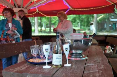 Unser erster Stopp führte uns zum Forsthaus Lindemannsruh auf dem Peterskopf, wo wir uns in dem schönen Biergarten mit einem JAG-typischen Sektfrühstück stärkten.