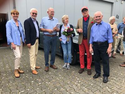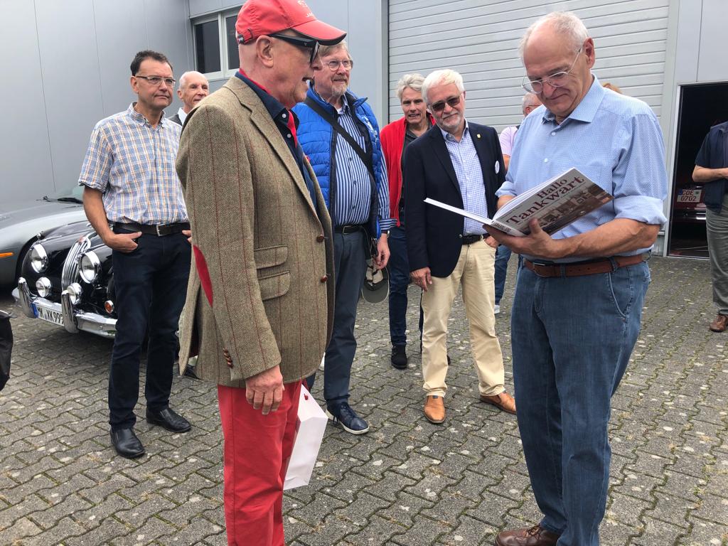 Nach tiefgehenden, lebhaften Benzingesprächen fuhren wir am späten Nachmittag alle wieder zufrieden unsere eigenen Garagen an. – Der Club bedankte sich für die großzügige Einladung mit einem Bildband über Tankstellen der Wirtschaftswunderzeit. Wer so viele Autos zusammengetragen hat braucht schließlich viel Sprit.