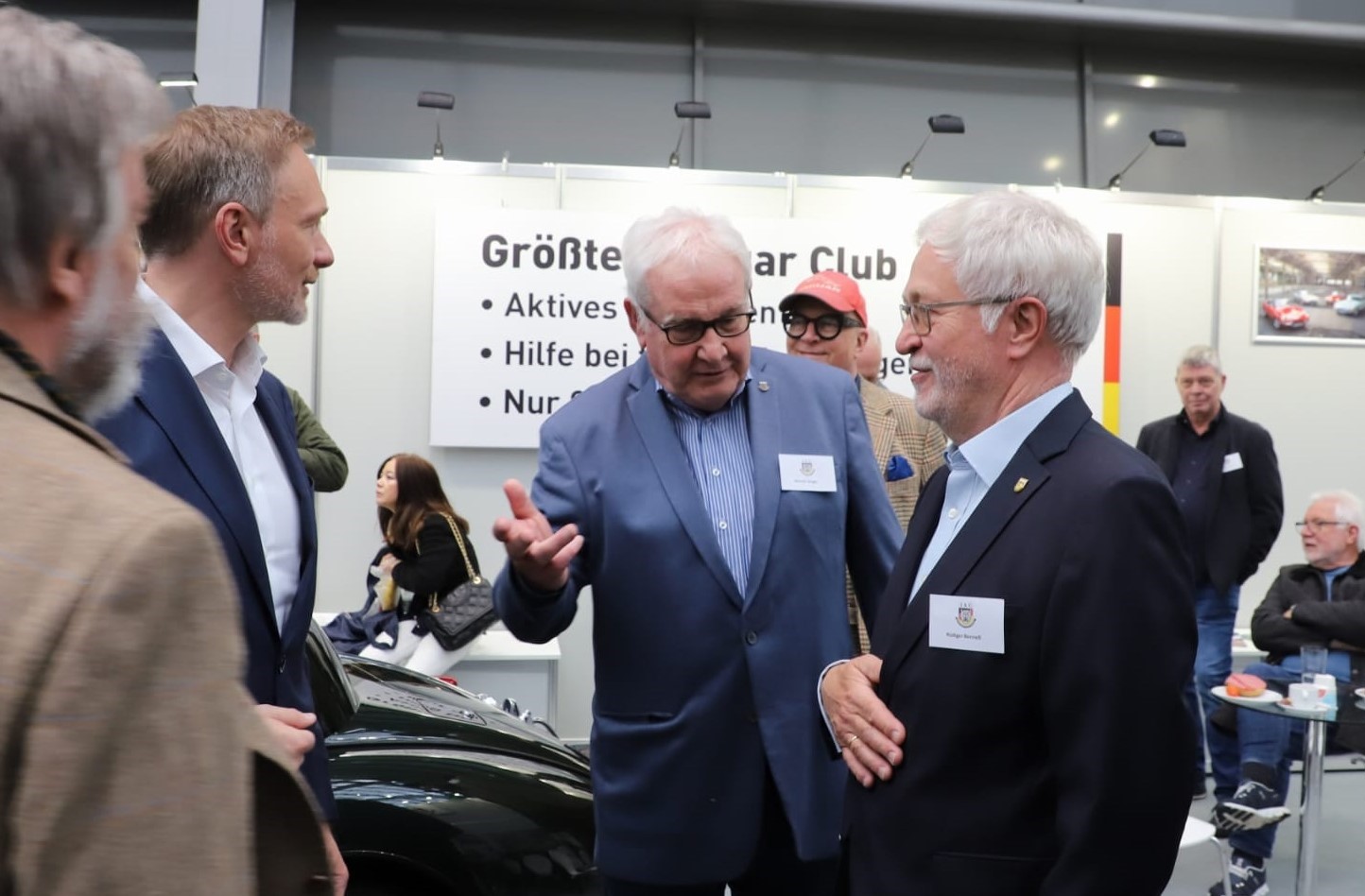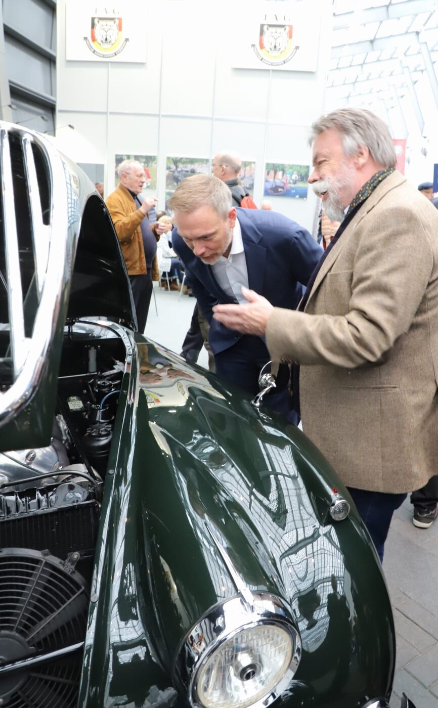 Auch ein Minister braucht mal eine Wohlfühlpause: Bundesfinanzminister Christian Lindner (FDP) machte bei seinem Messerundgang auf der Techno Classica 2024 einen kurzen Boxenstop am Stand unseres Clubs, wo auch die Sektionsleiter Bernward Sandmann und Joachim Schlosser bereit standen. Nach kurzer Begrüßung durch den Präsidenten Rüdiger Bonneß ließ der XK 140 FHC von Hans-Erich Gossler das Ministerherz höher schlagen. Mike Riedner erläuterte sachkundig und lebhaft dem Porsche-Fahrer Lindner die Unterschiede zwischen dem Vierzylinder-Boxermotor des Porsches aus den 50er Jahren und dem Jaguar mit seinem Reihensechszylinder. Allein schon der Anblick des roten Zylinderkopfes mit den polierten Ventildeckeln gefiel dem Gast ausgesprochen gut. Lindner nahm sich Zeit und stieg noch in den Fahrersitz des Sportwagens, dessen Lack in British-Racing-Green glänzte. Die Begleitung drängte schon zum Aufbruch, als der Gast aus Berlin noch immer das polierte Holz des Armaturenbretts bewunderte. Unser Dank gilt Peter Schneider vom DEUVET, der die Visite einfädelte.